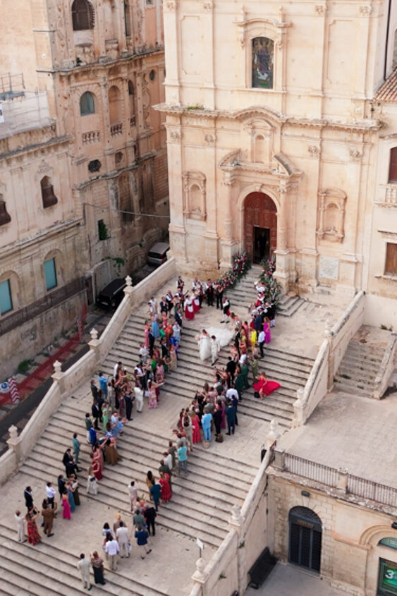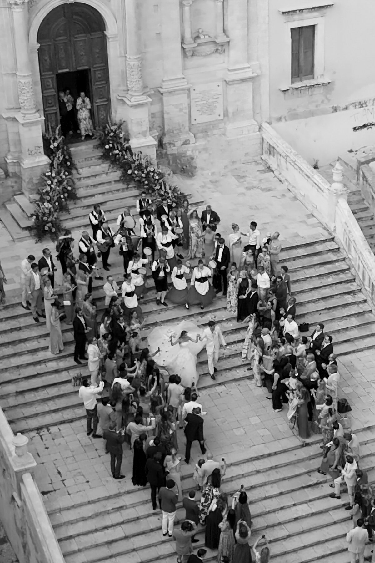The church ceremony was held in historic Noto, where a grand staircase led up to the altar, creating a dramatic and beautiful setting. As the couple exited the church, they were met with cheers from guests gathered on the stairs, accompanied by a traditional Sicilian folk band playing joyous tunes —a truly epic and emotional moment.
