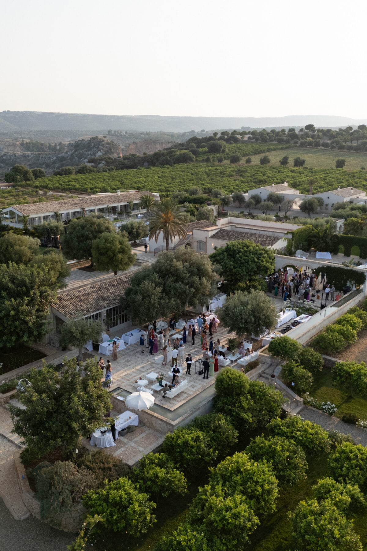 After the ceremony, the couple took a charming ride through Sicilian streets in a vintage car, adding a touch of classic elegance to the day. The celebration continued with an unforgettable sunset aperitivo featuring oysters, cheeses, and exquisite local delicacies, creating the perfect prelude to a lively evening.