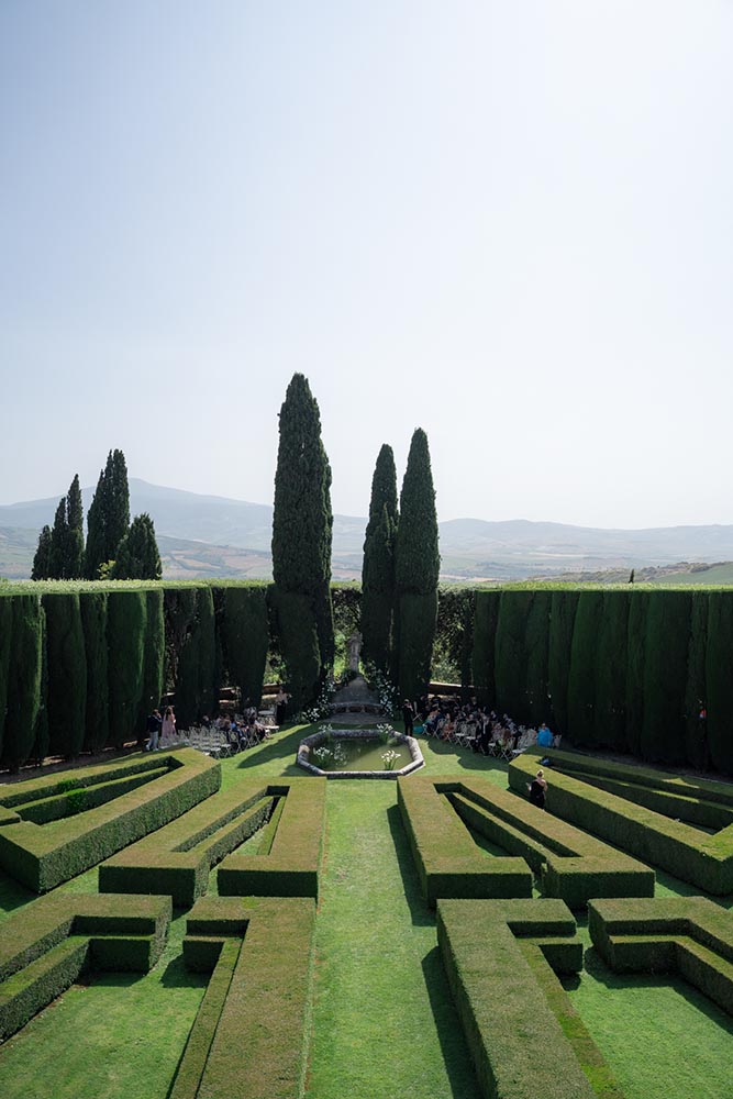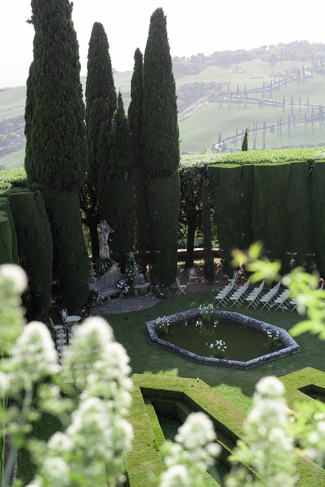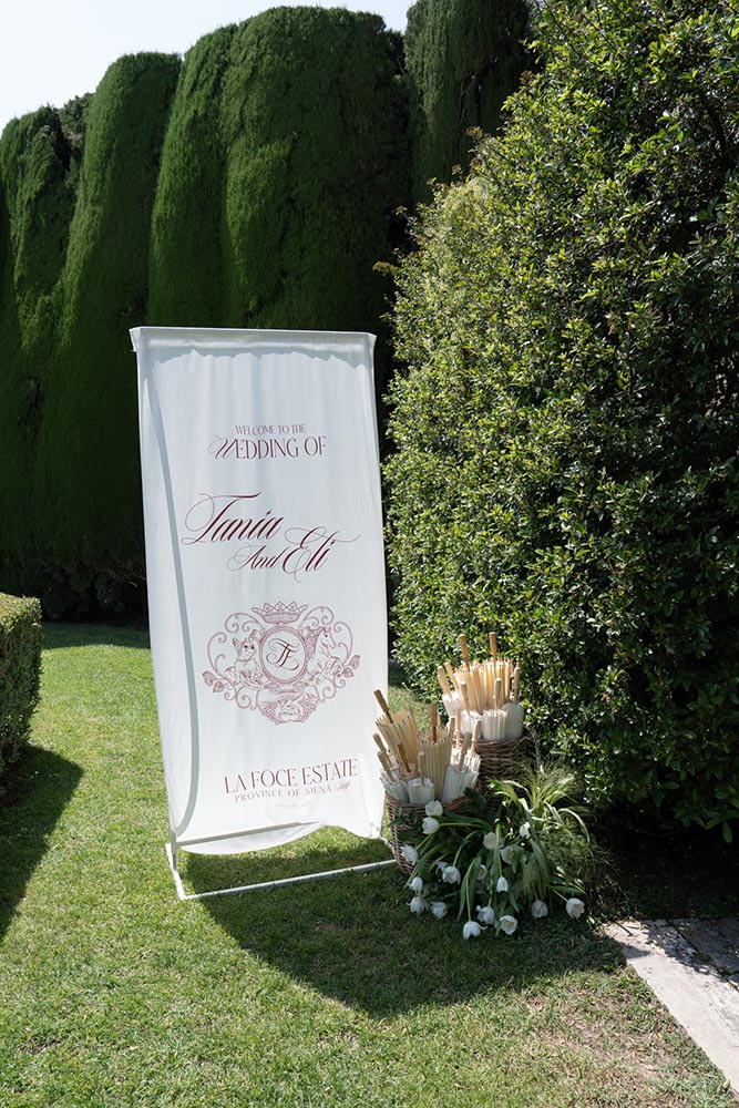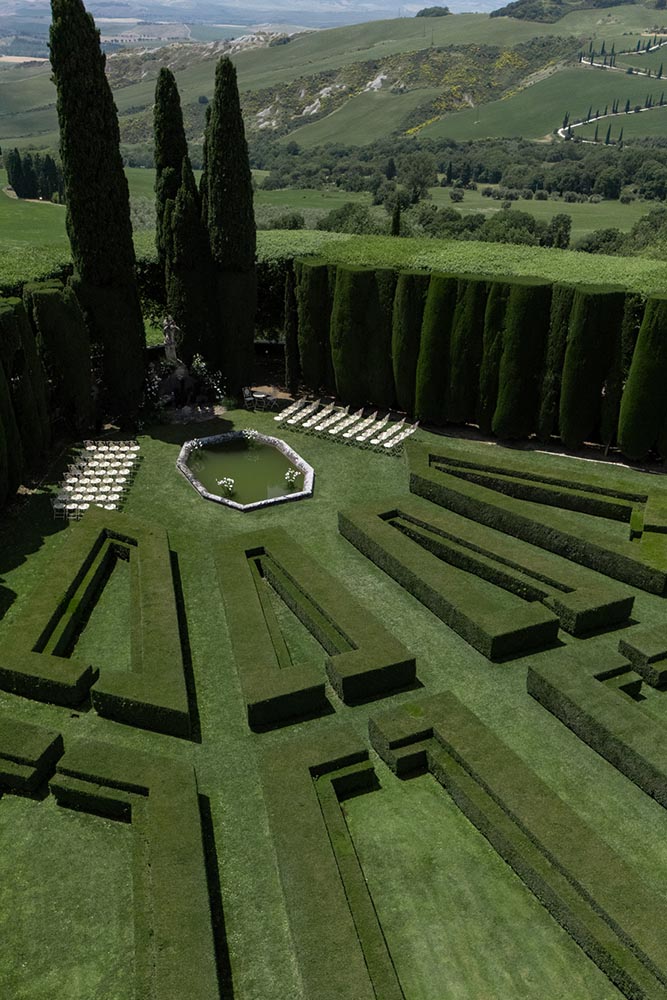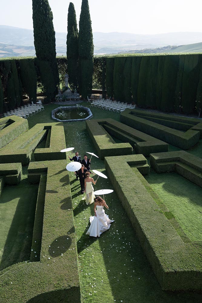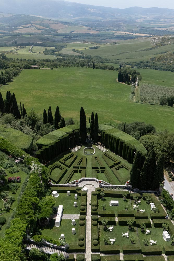 La Foce, with its world-renowned Italian gardens and sweeping Tuscan hills, set the stage for a truly iconic celebration — a wedding that blended timeless elegance with bold, artistic vision.