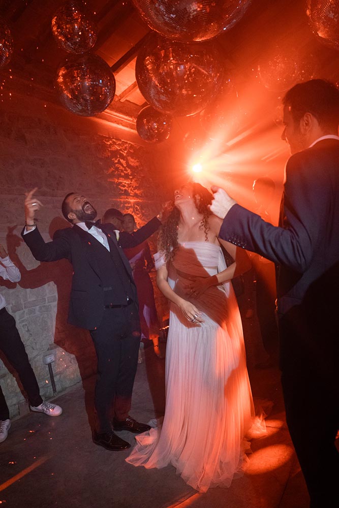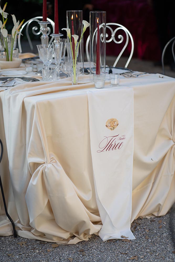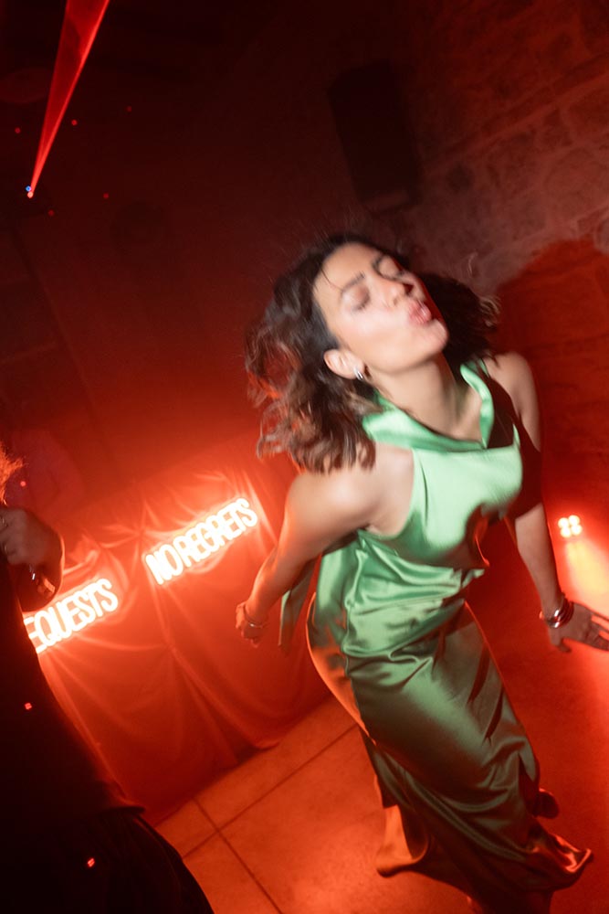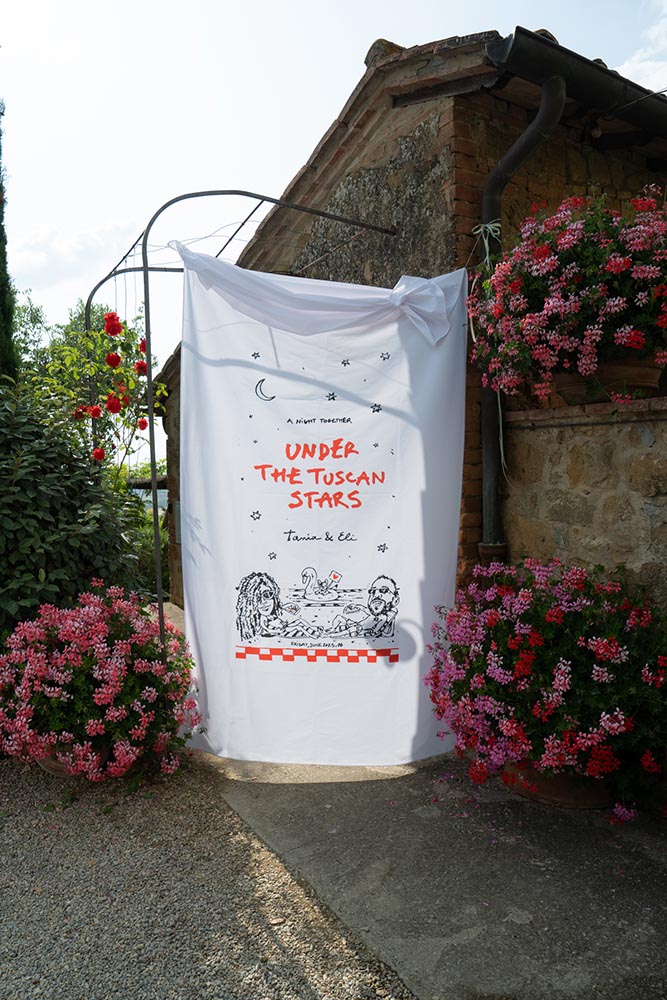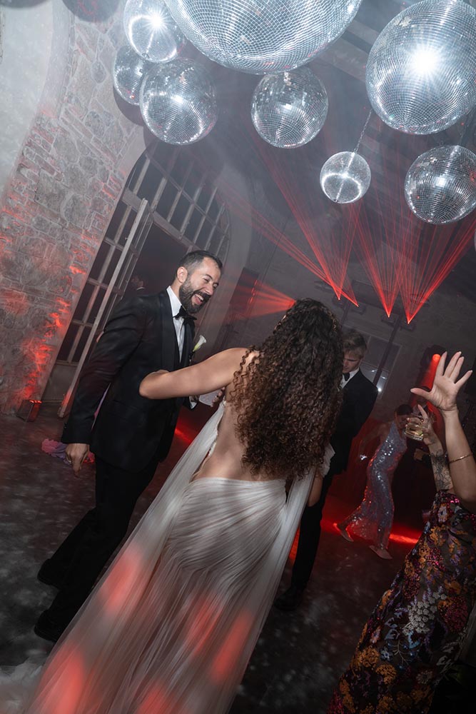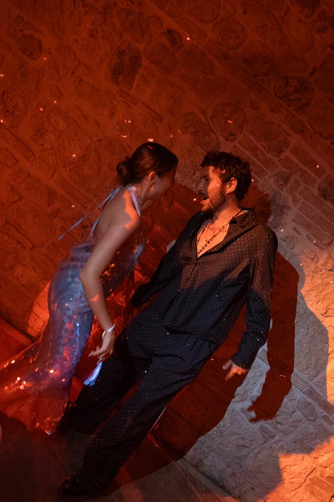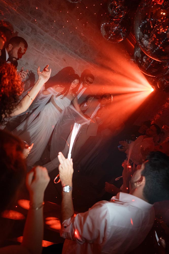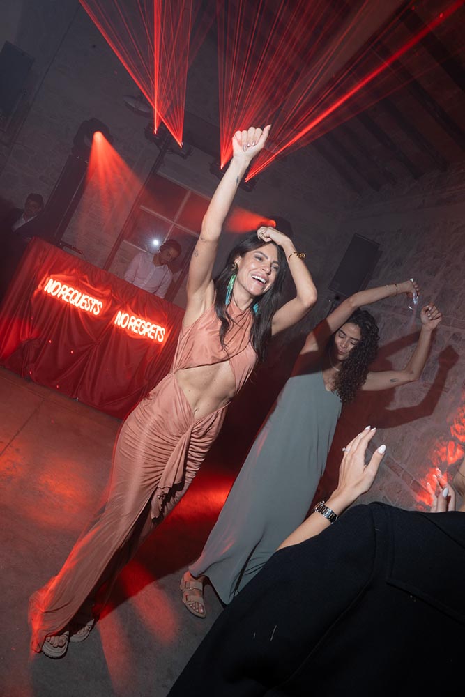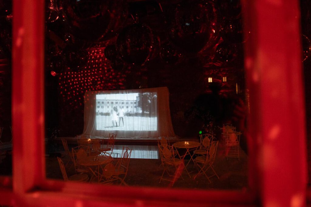 The night didn’t end there. A historic room at La Foce was transformed into a red-lit club space, complete with lasers, flowing fabrics, and cinematic projections of the couple riding horses through the Tuscan hills. The vibe was wild, elevated, and unforgettable – a full-blown afterparty experience in the heart of Tuscany.