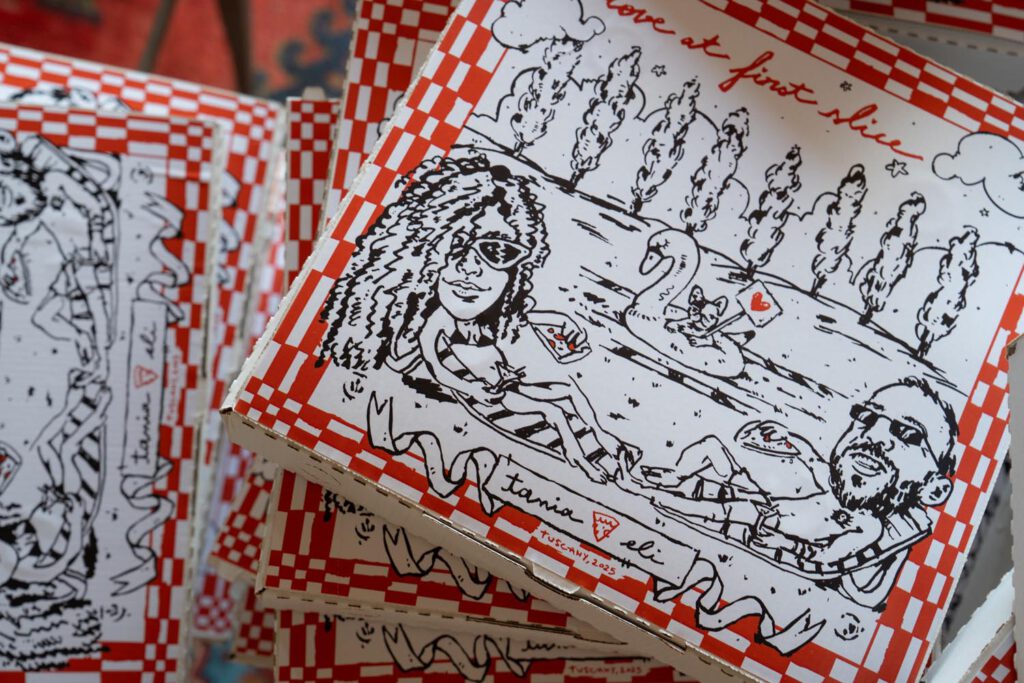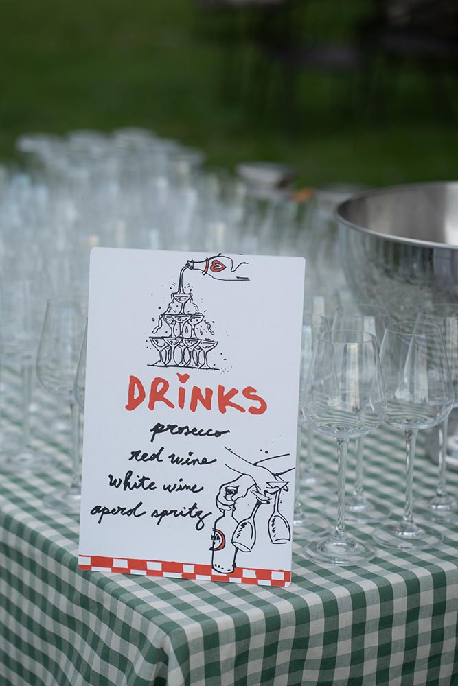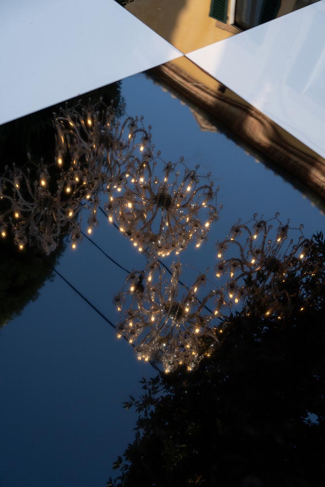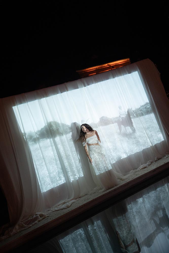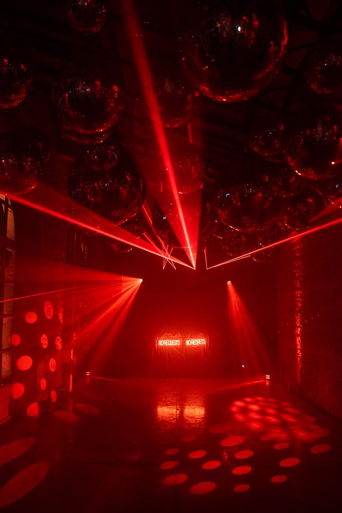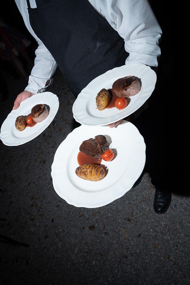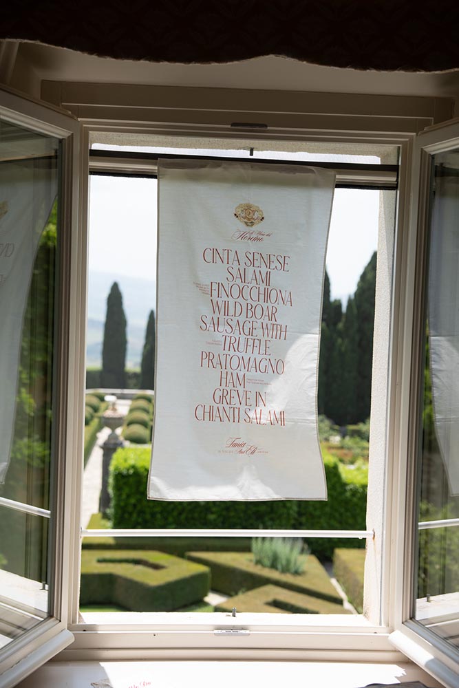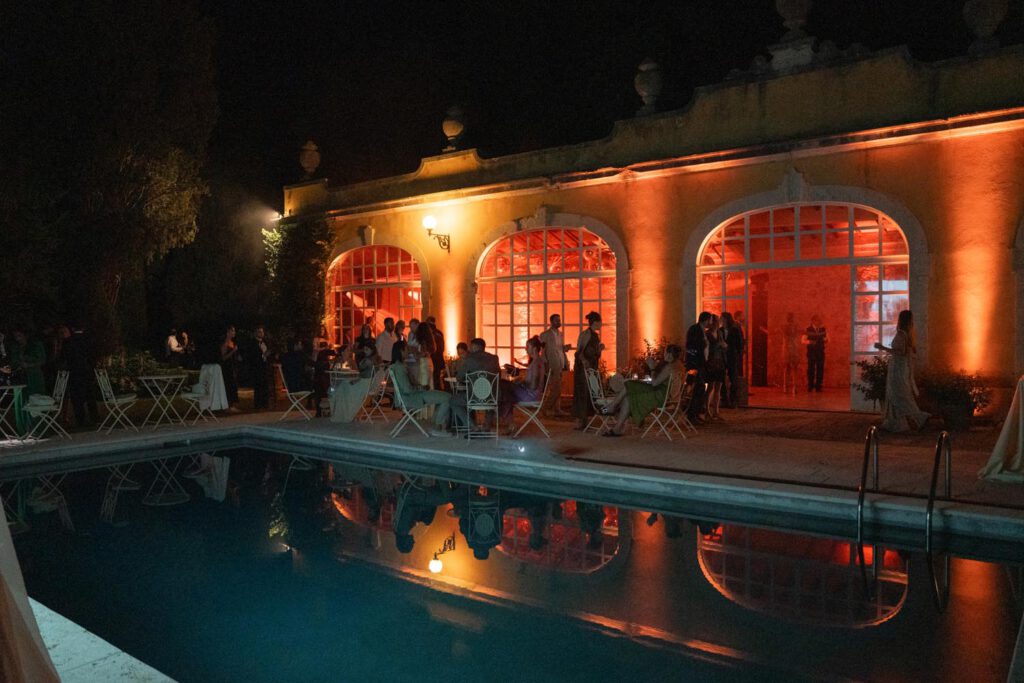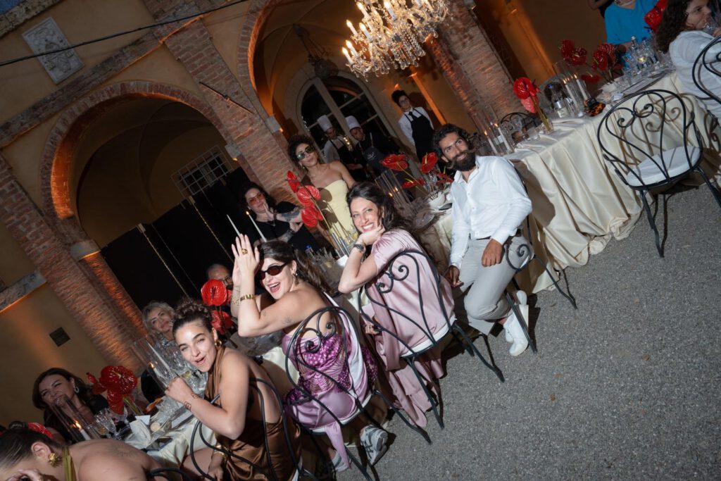 The night didn’t end there. A historic room at La Foce was transformed into a red-lit club space, complete with lasers, flowing fabrics, and cinematic projections of the couple riding horses through the Tuscan hills. The vibe was wild, elevated, and unforgettable – a full-blown afterparty experience in the heart of Tuscany.