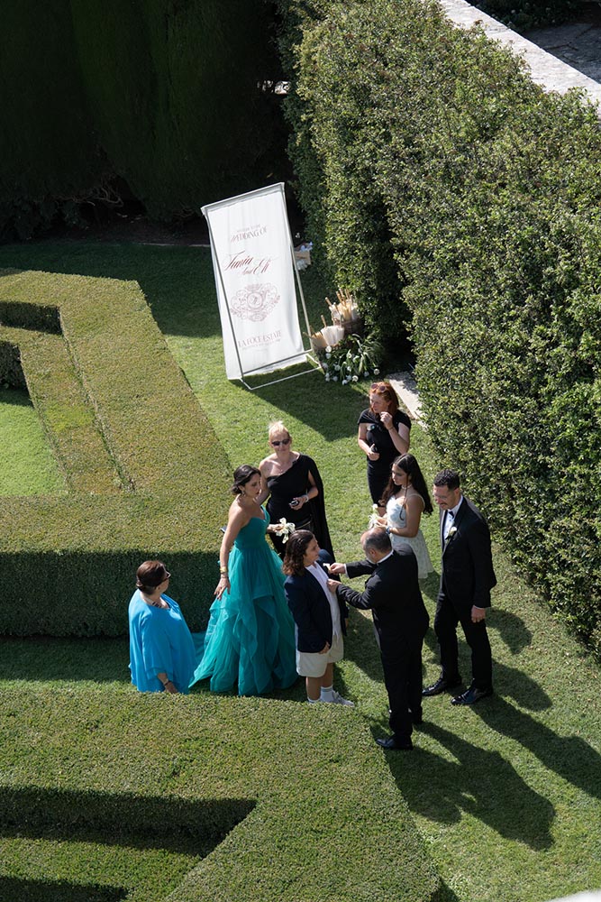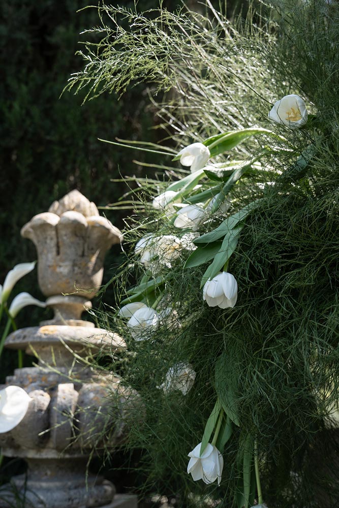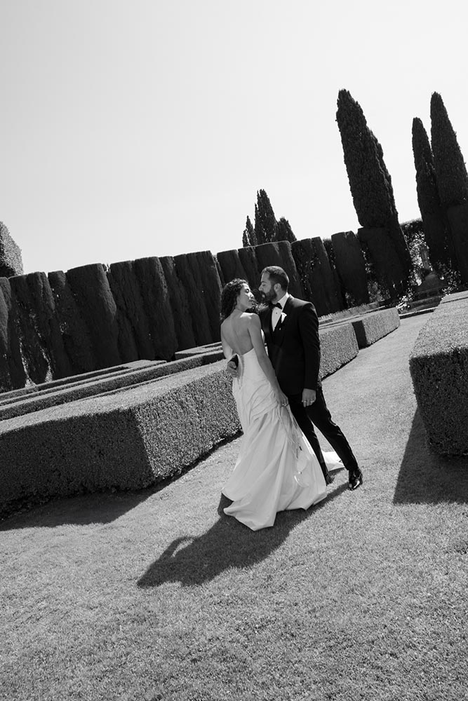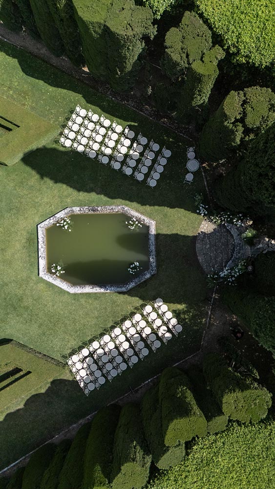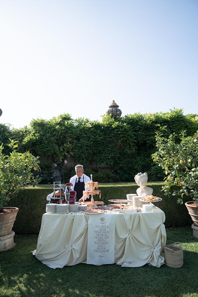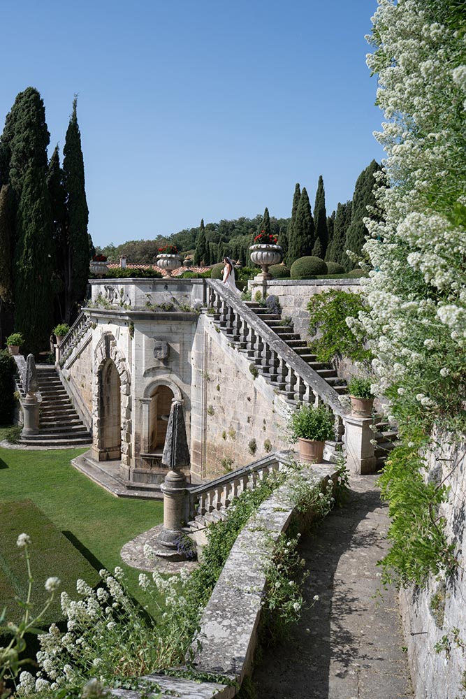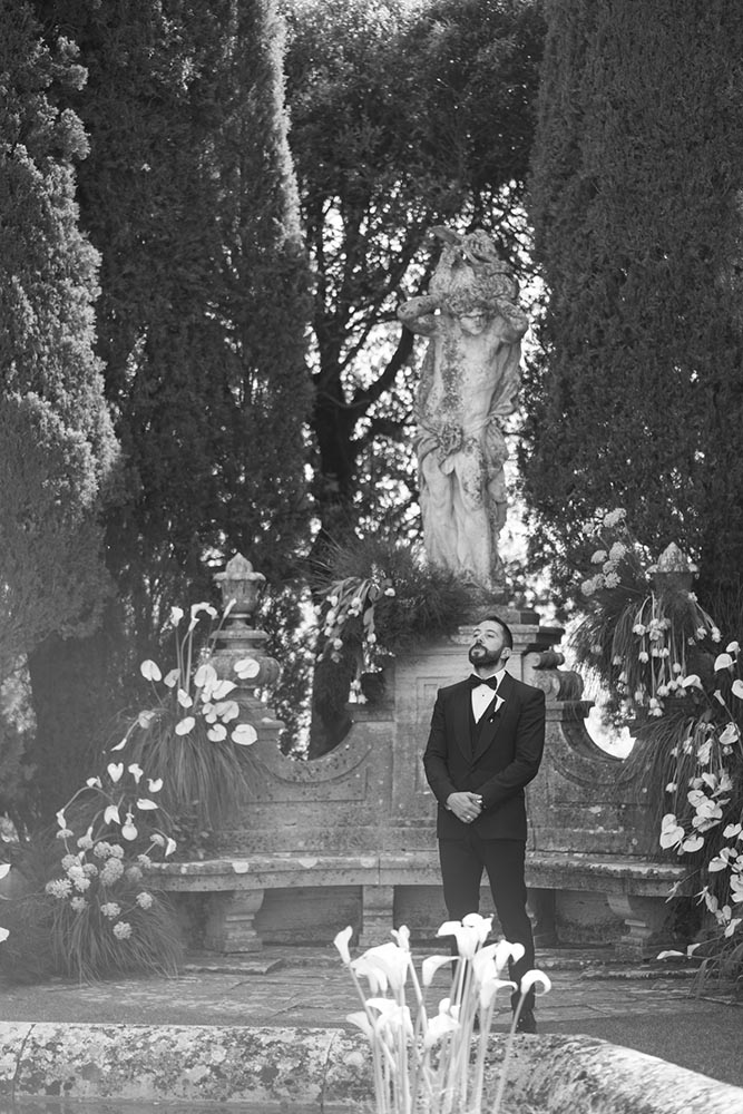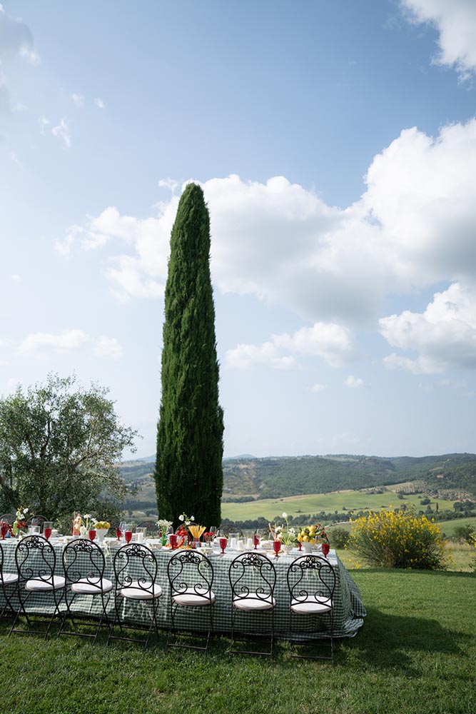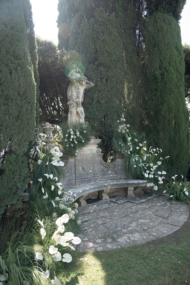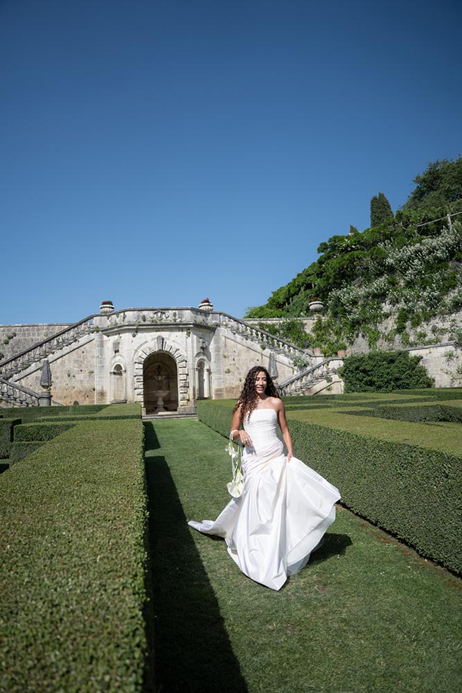 The ceremony took place at the peak of La Foce’s iconic Italian garden – a dramatic and unforgettable location. The floral design and decor were minimalist yet artistic, letting the natural grandeur speak for itself.
