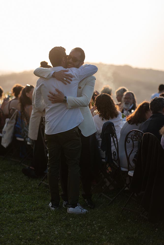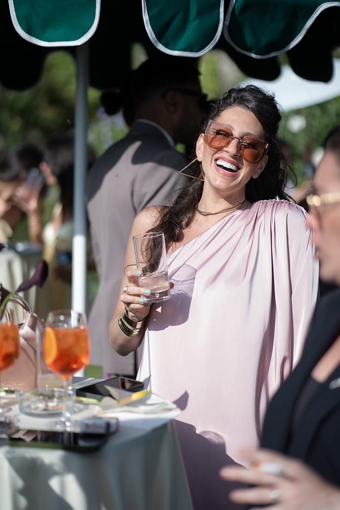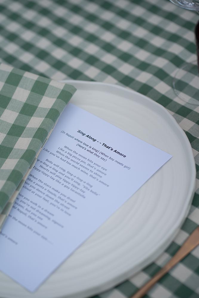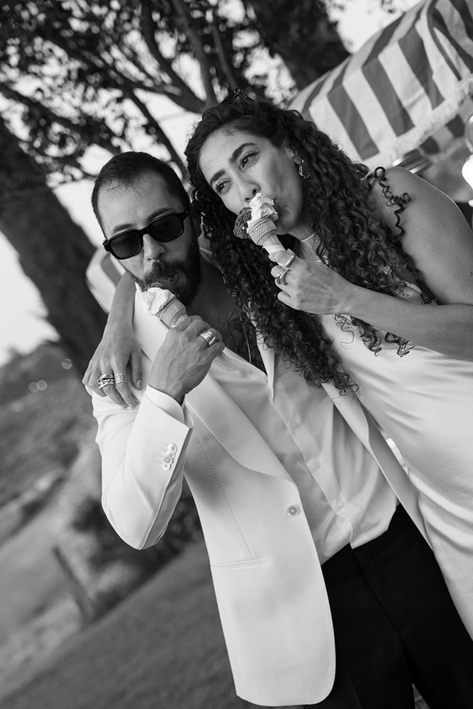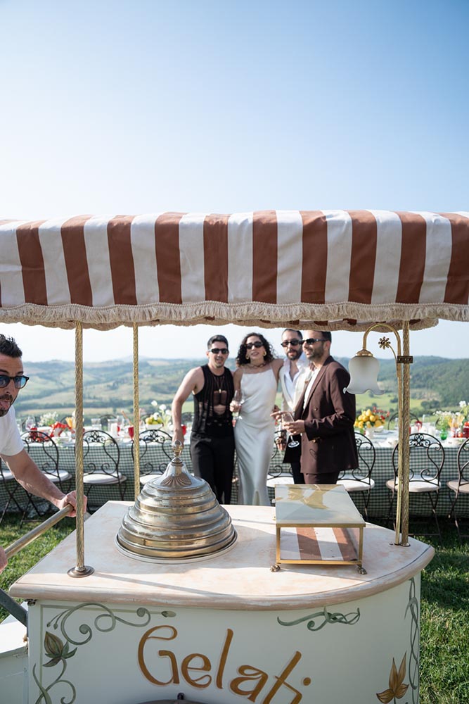 The festivities began with a La Dolce Vita-inspired welcome dinner: a single, spectacular long table beneath the open sky, overlooking the golden hills. Surrounded by soulful live music, dancing, and laughter, guests dined on the finest Italian cuisine. A charming gelato cart added a whimsical touch, while the atmosphere radiated warmth and joy.