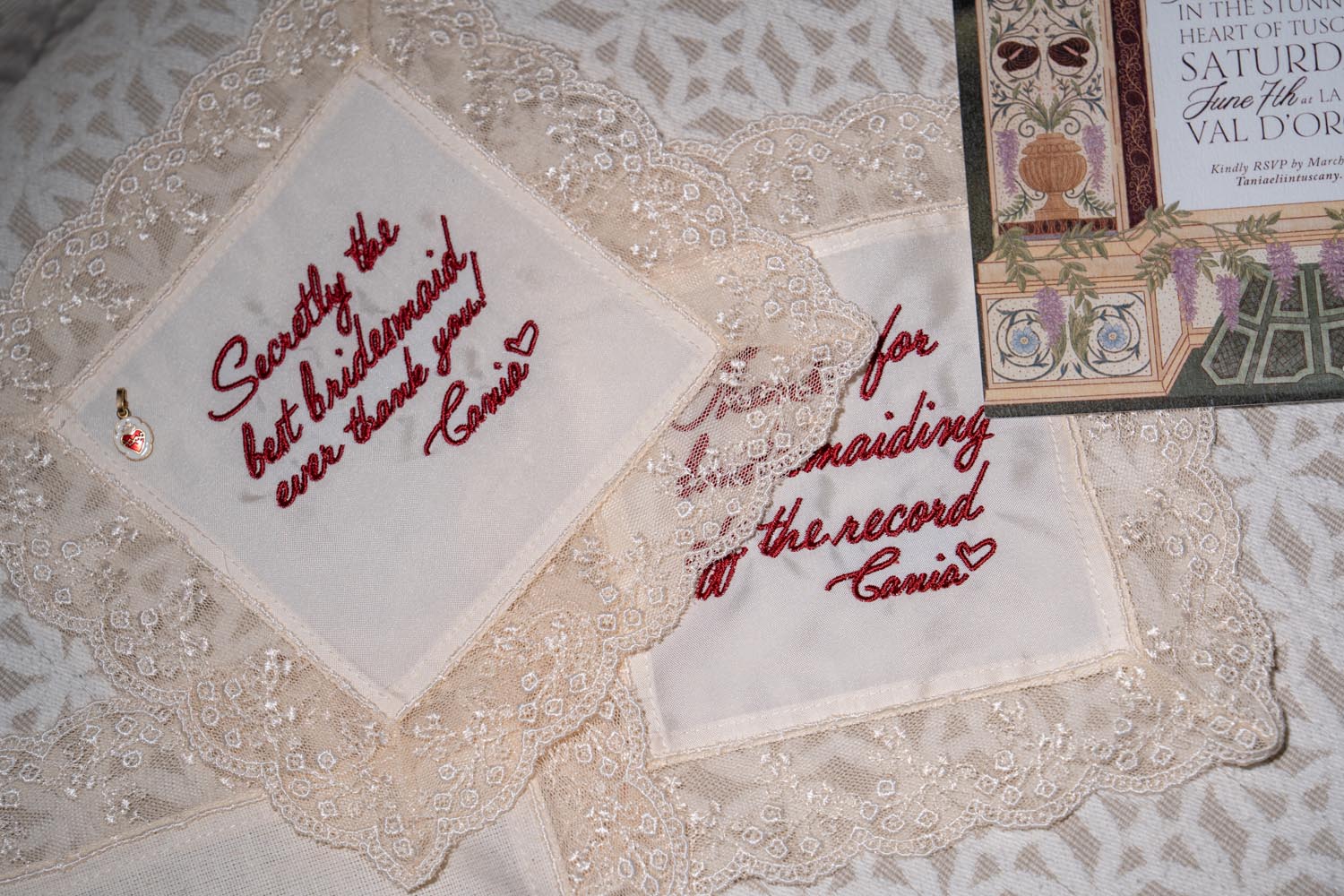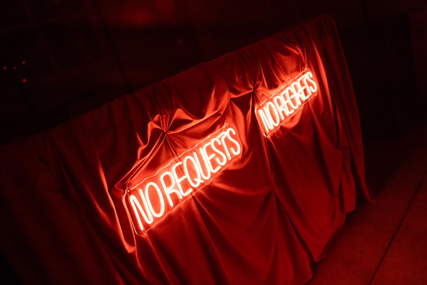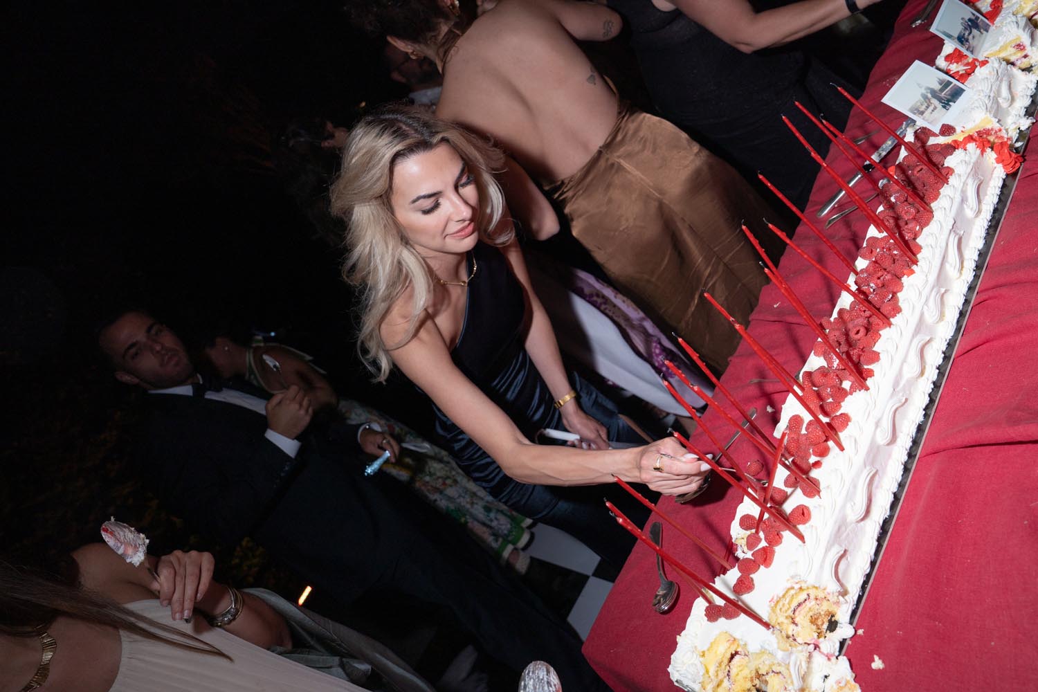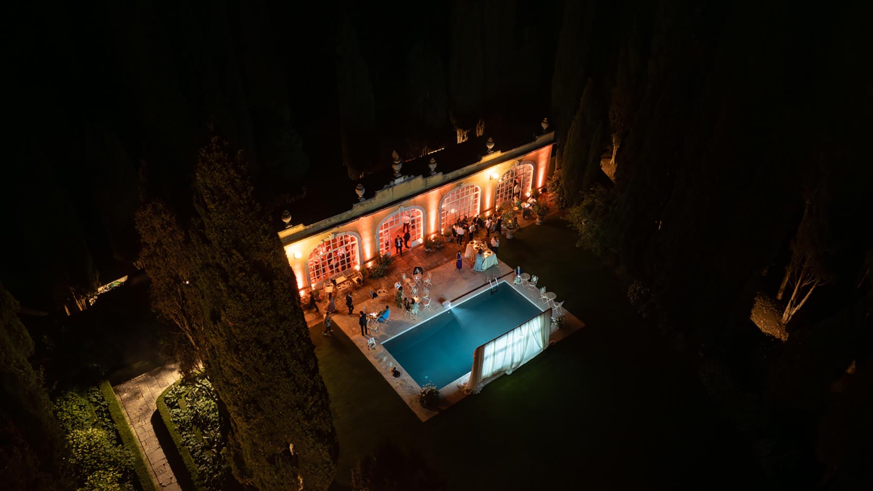 The night didn’t end there. A historic room at La Foce was transformed into a red-lit club space, complete with lasers, flowing fabrics, and cinematic projections of the couple riding horses through the Tuscan hills. The vibe was wild, elevated, and unforgettable – a full-blown afterparty experience in the heart of Tuscany.