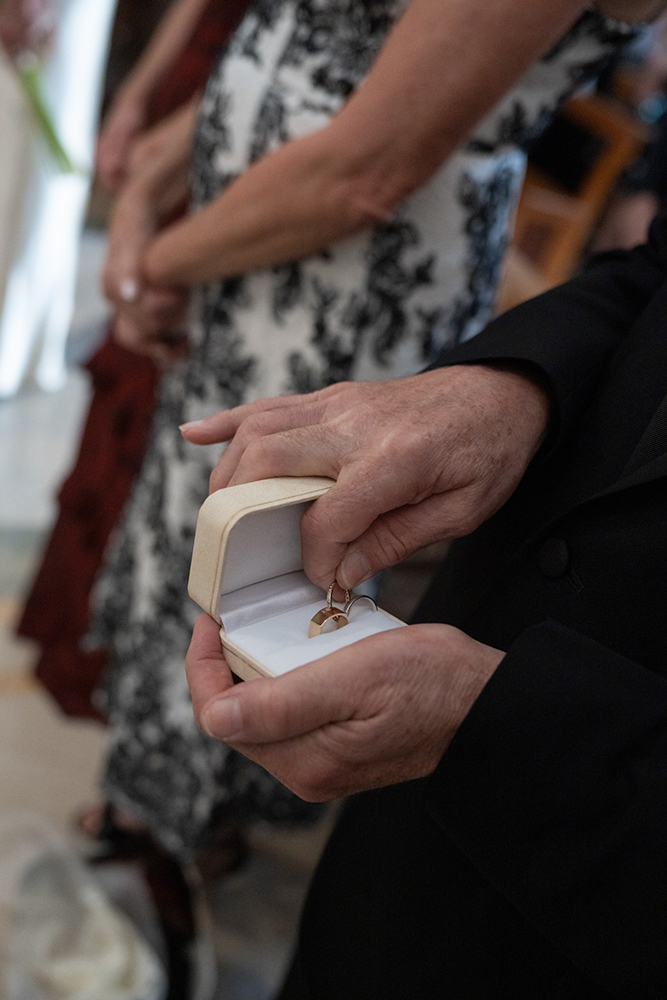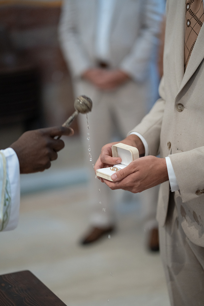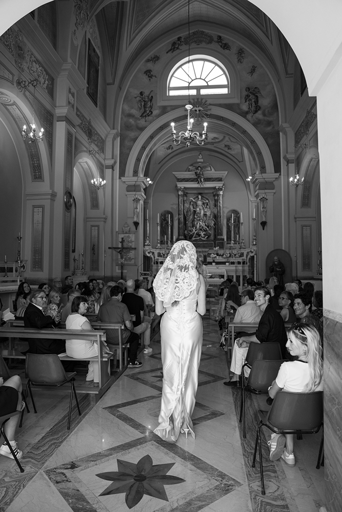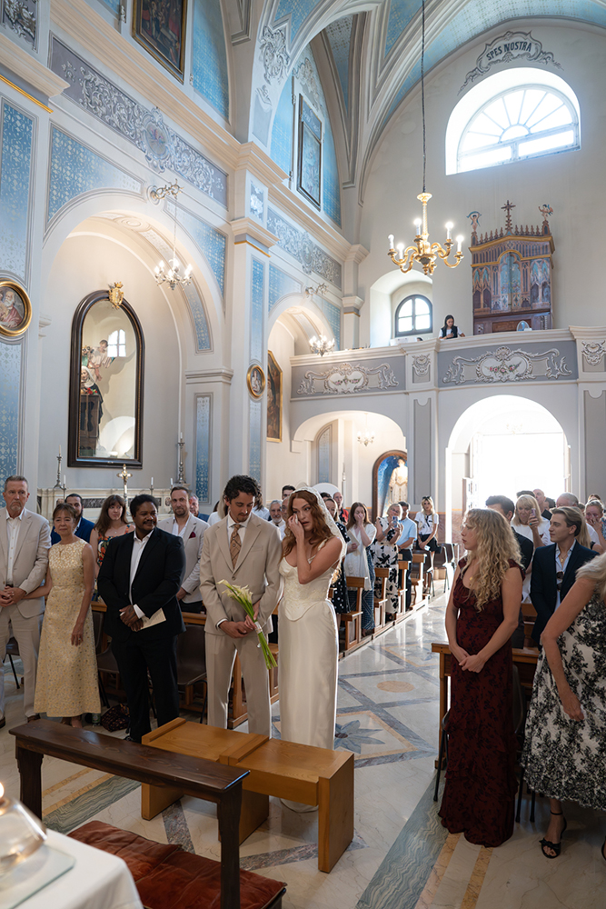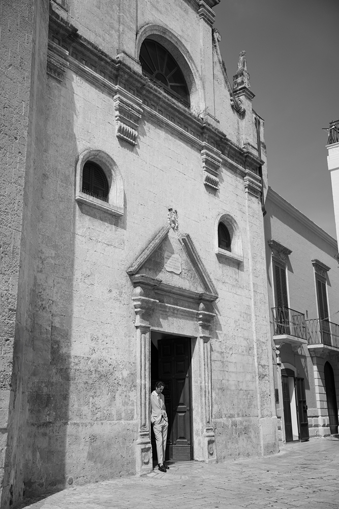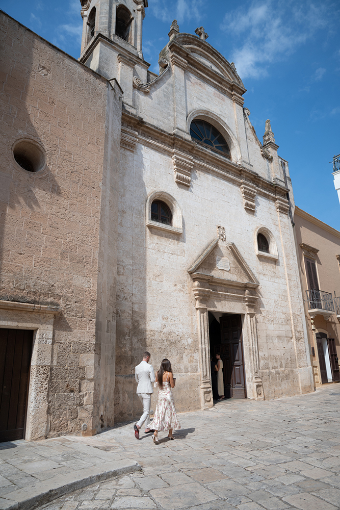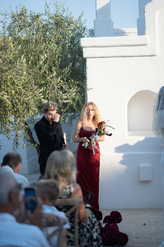 The wedding day itself unfolded in layers. The morning began with a traditional church ceremony, honoring Italian heritage and family roots, followed by a symbolic ceremony in the afternoon at Masseria Borgo Ritella. This dual ceremony structure allowed the couple to blend tradition with personal expression — sacred and emotional, yet modern and free.