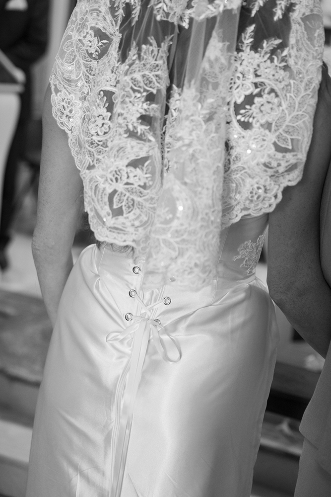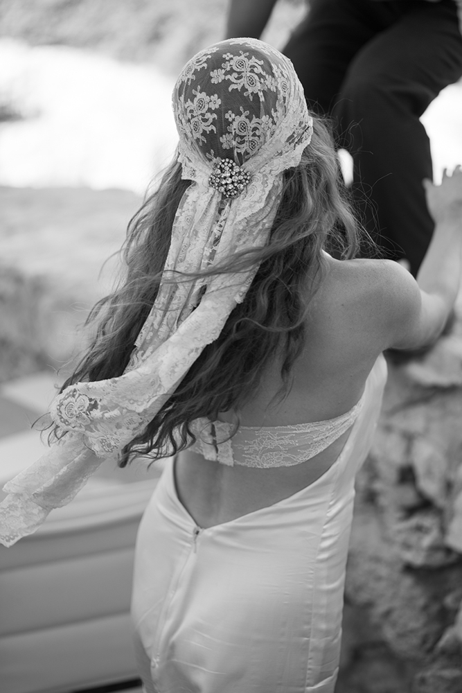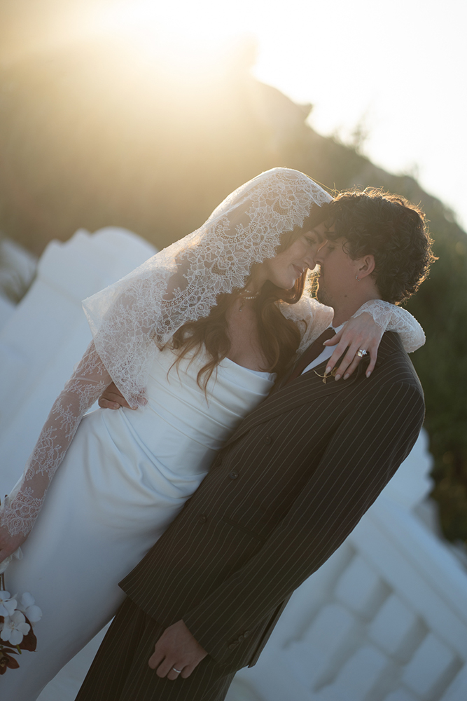 • A statement dress for the free ceremony, featuring a lace veil-hood that transformed into a sleek, veil-free dinner look styled with long gloves