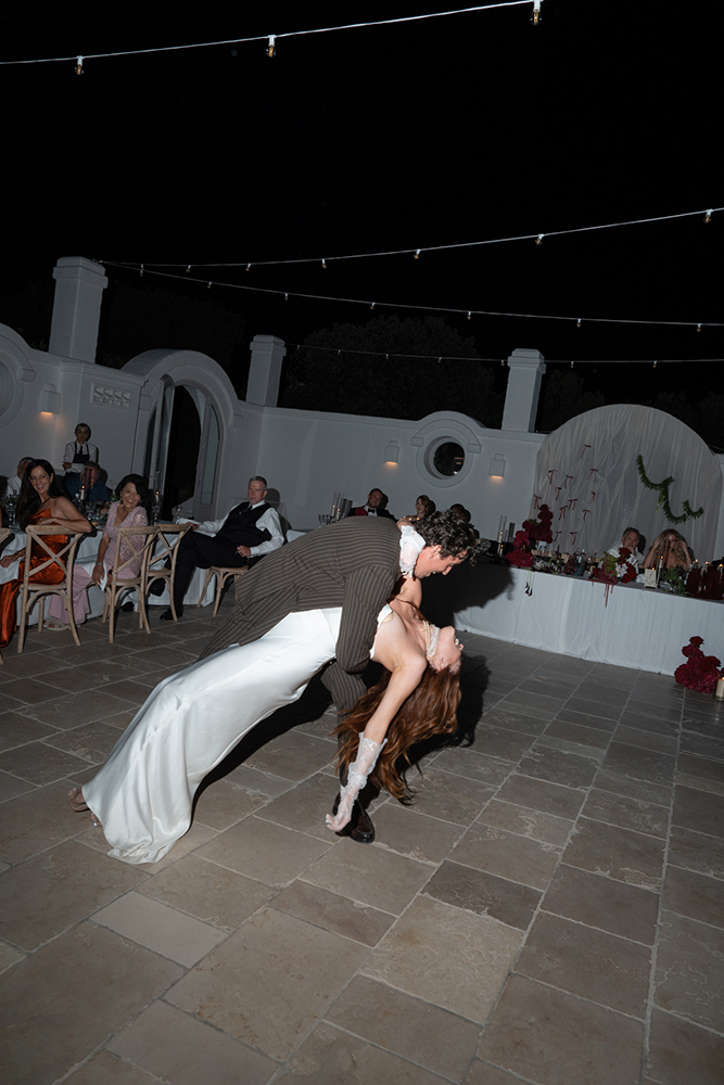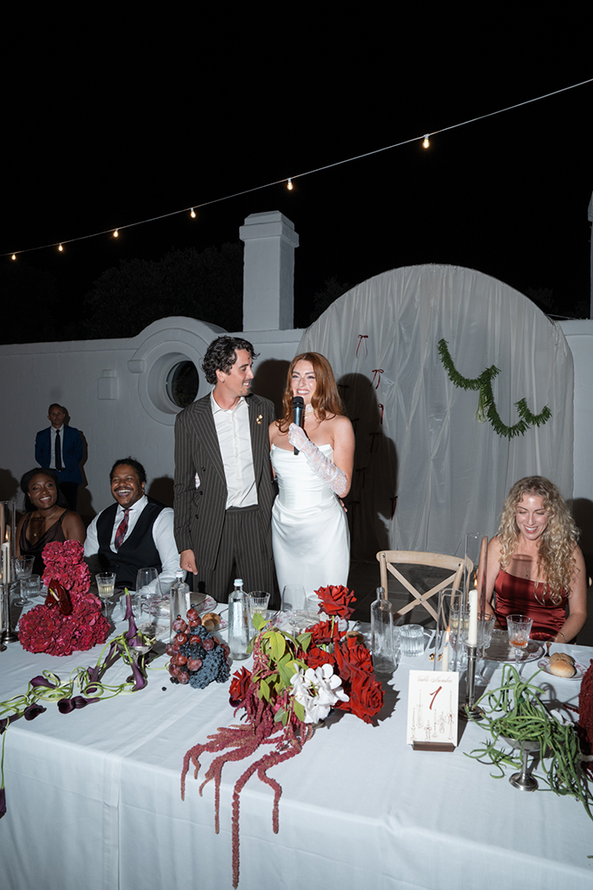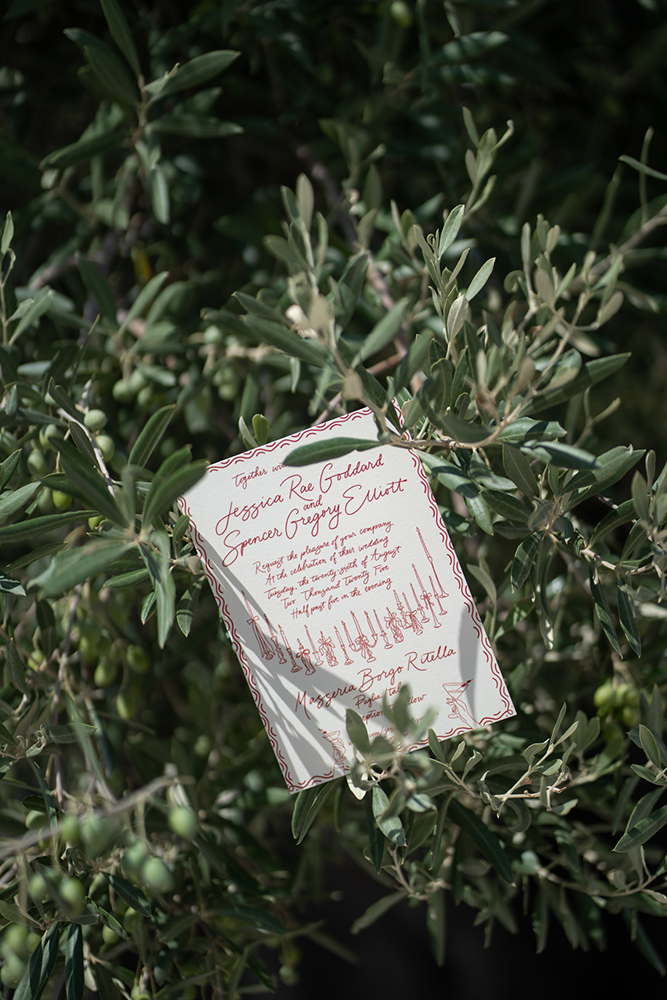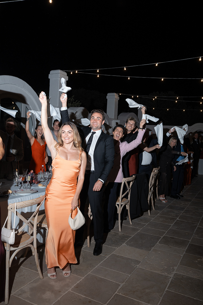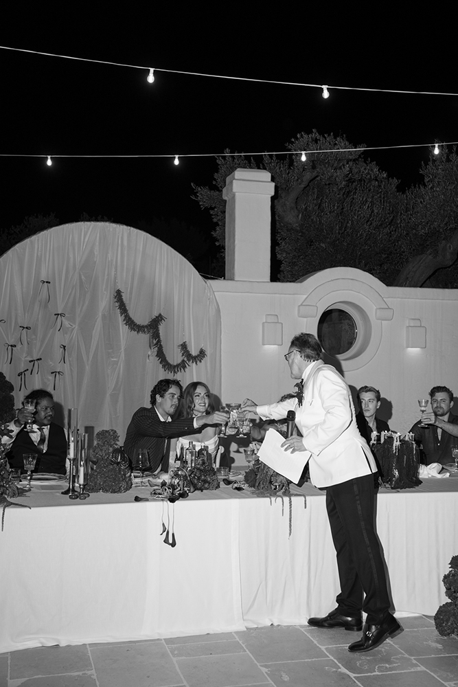 Personal details elevated the experience further: illustrated stationery and signage by Flourish Co., blending Puglian symbols with martini glasses and Hollywood glamour, and vintage Italian postcards placed at each guest’s seat, handwritten with personal messages and revealed during the couple’s thank-you speech.