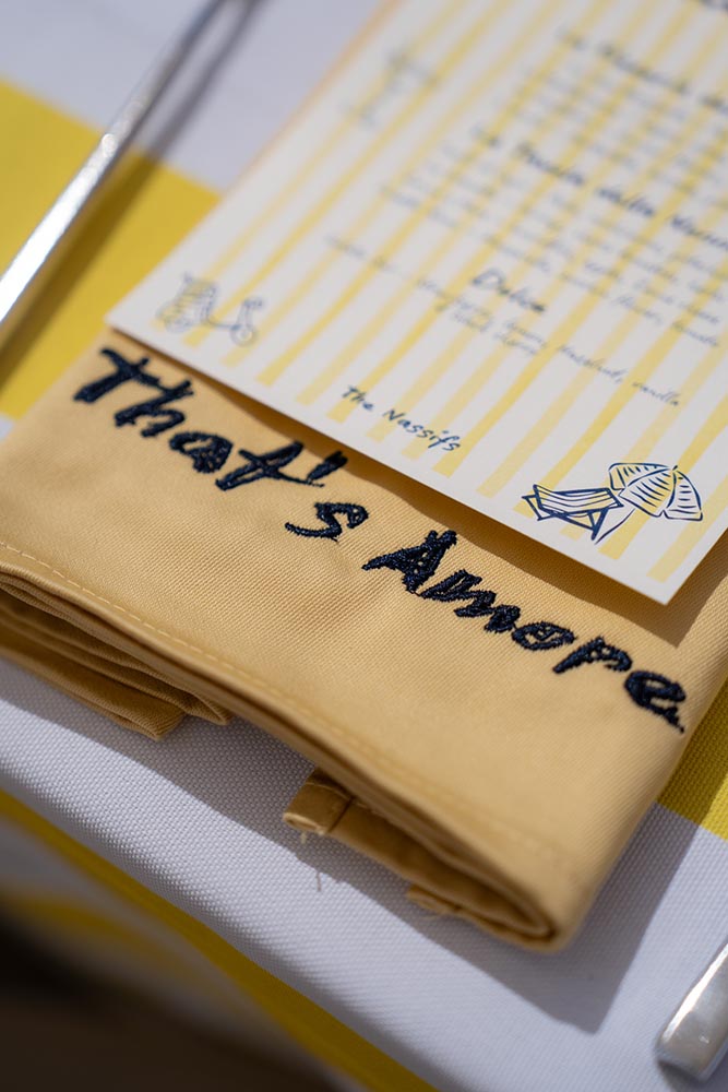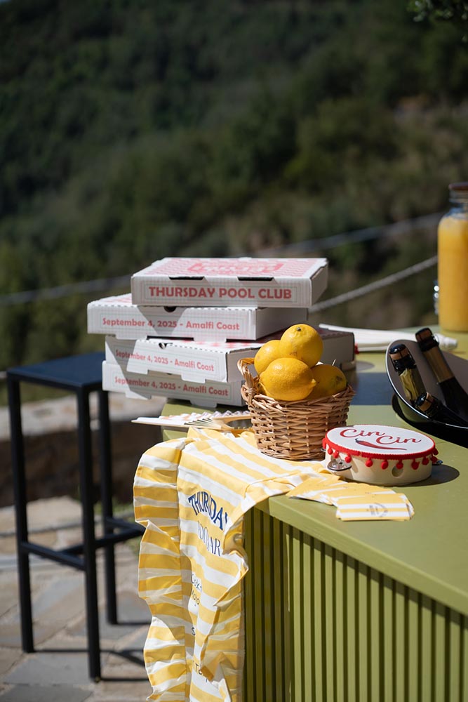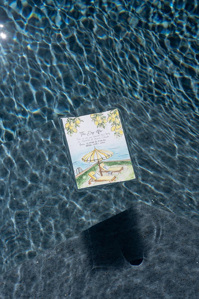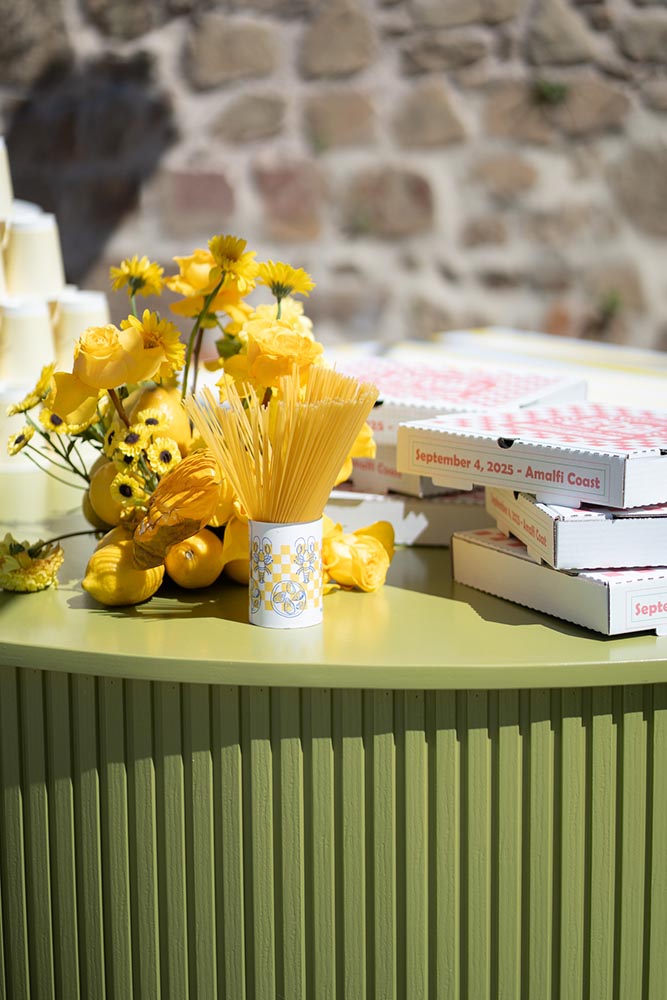 The celebration continued the next day with a pool and pizza party, once again entirely designed by the bride. From personalized pizza boxes to custom towels and a fully styled bar area, every detail carried the same level of intention and creativity as the wedding day itself.