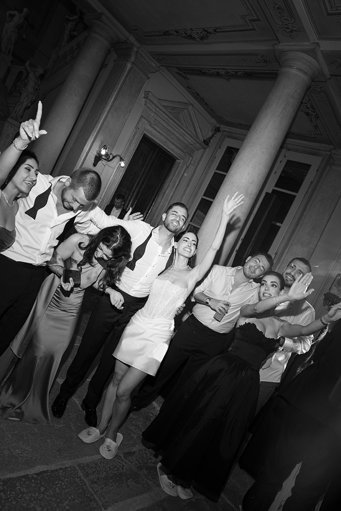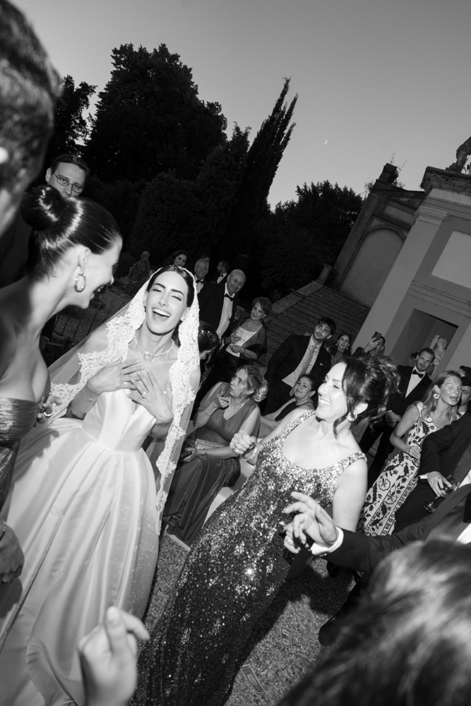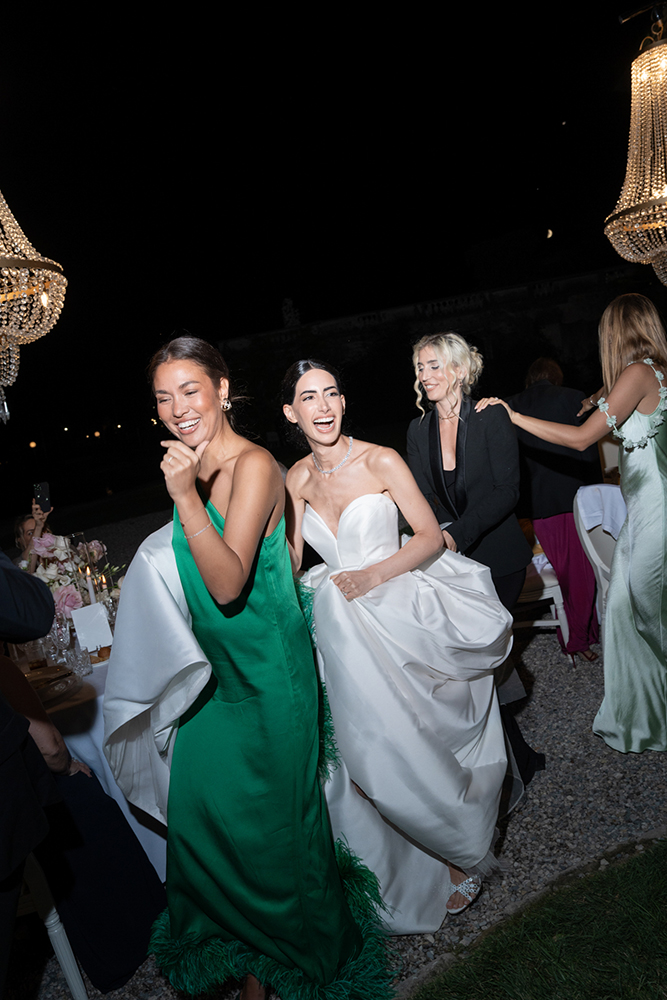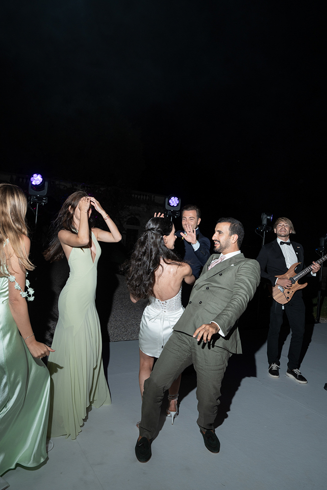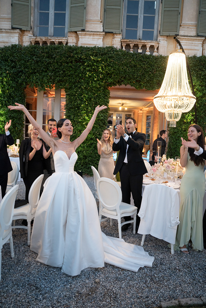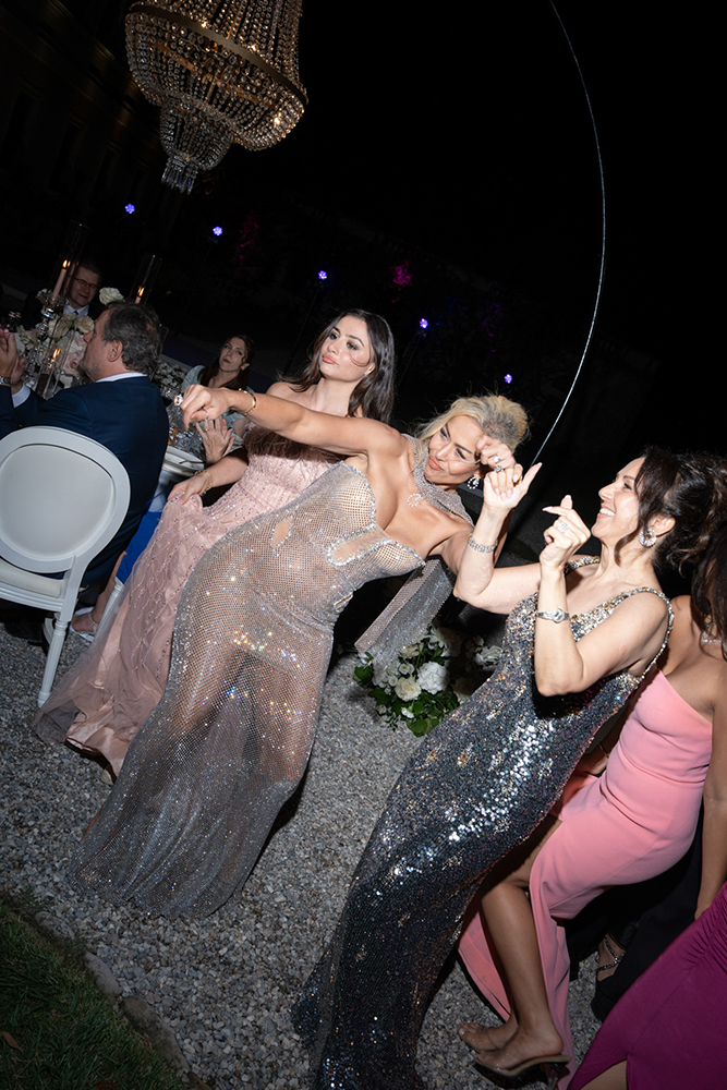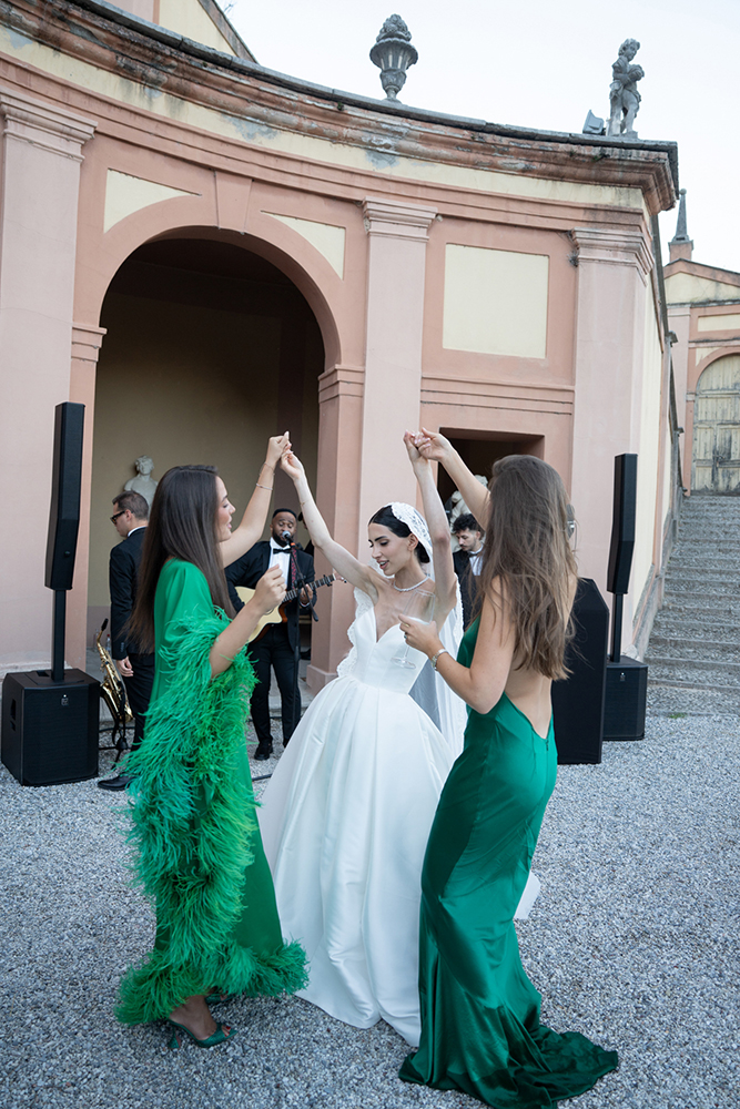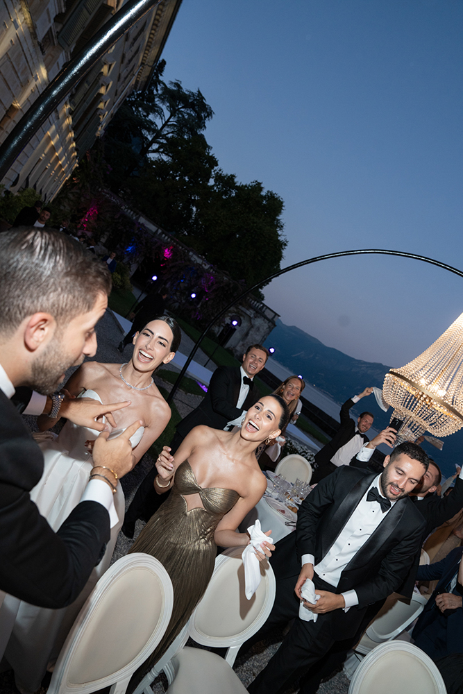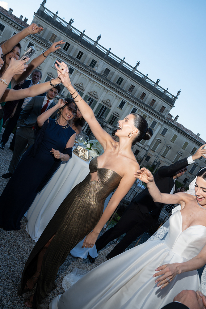 The bride wore a striking Vera Wang wedding dress , becoming an undeniable focal point throughout the day. During the aperitivo, the celebration transformed into an energetic day party, with live music by Bravo Wedding Music carrying from afternoon into the evening. Guests sang along, danced freely in the villa gardens, and embraced the unfiltered joy that defined the entire celebration.