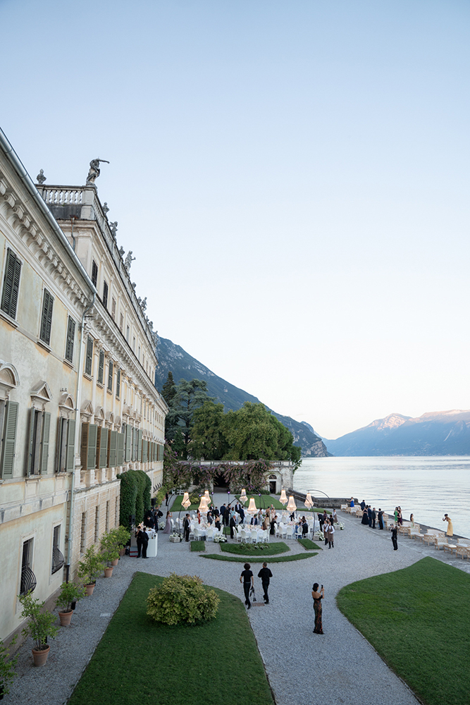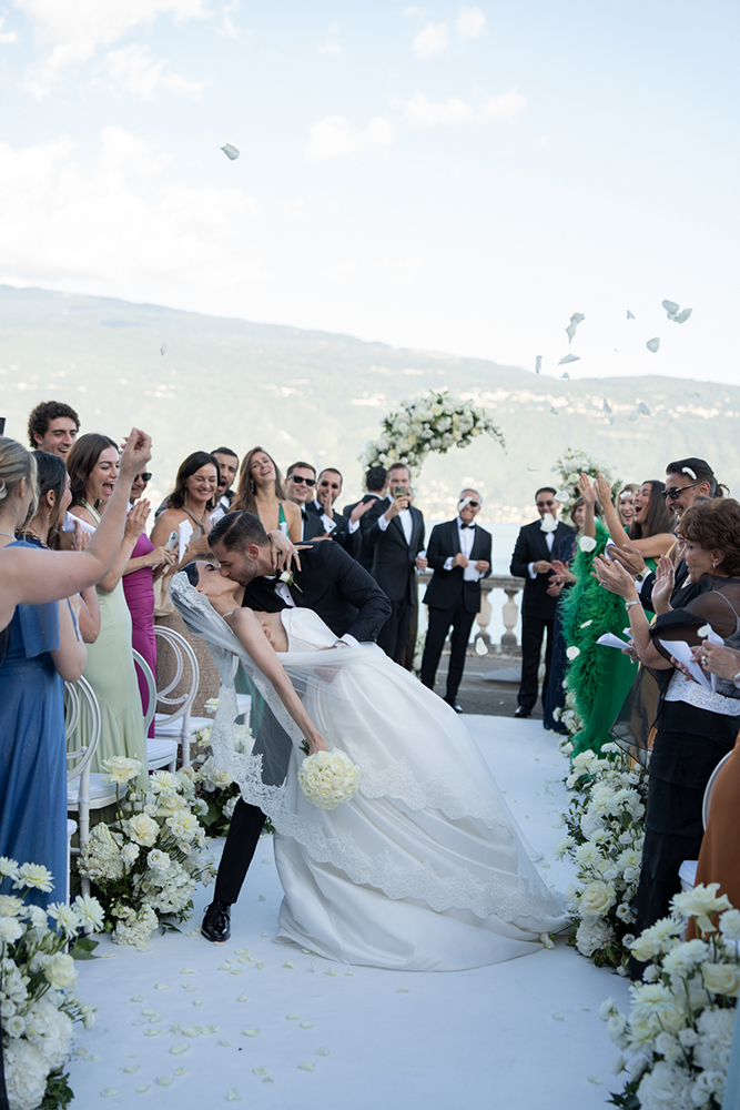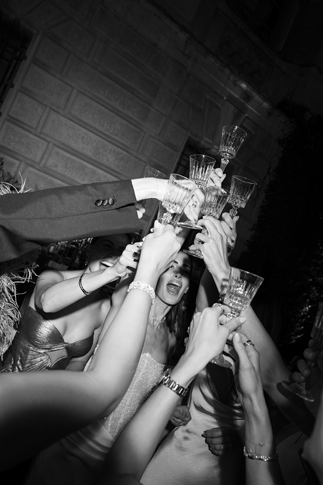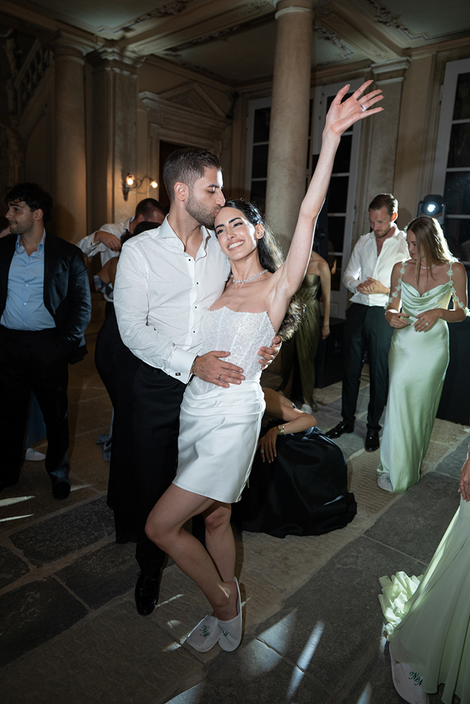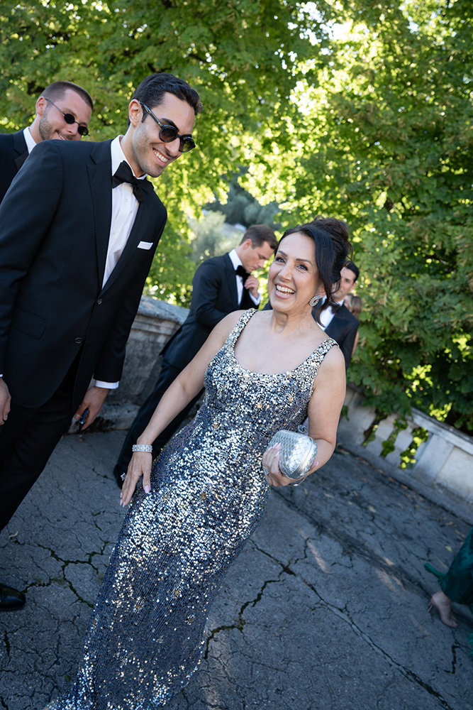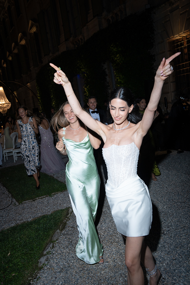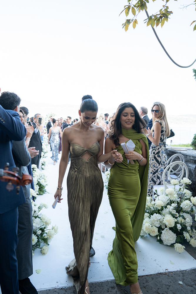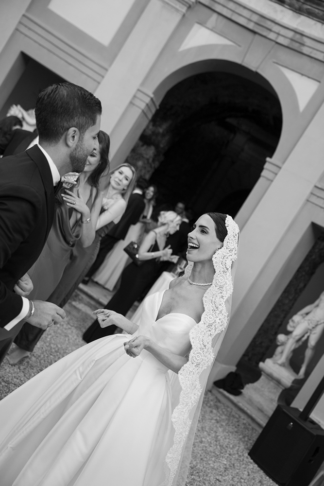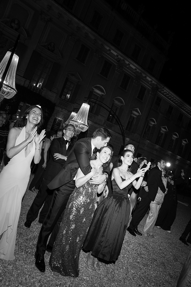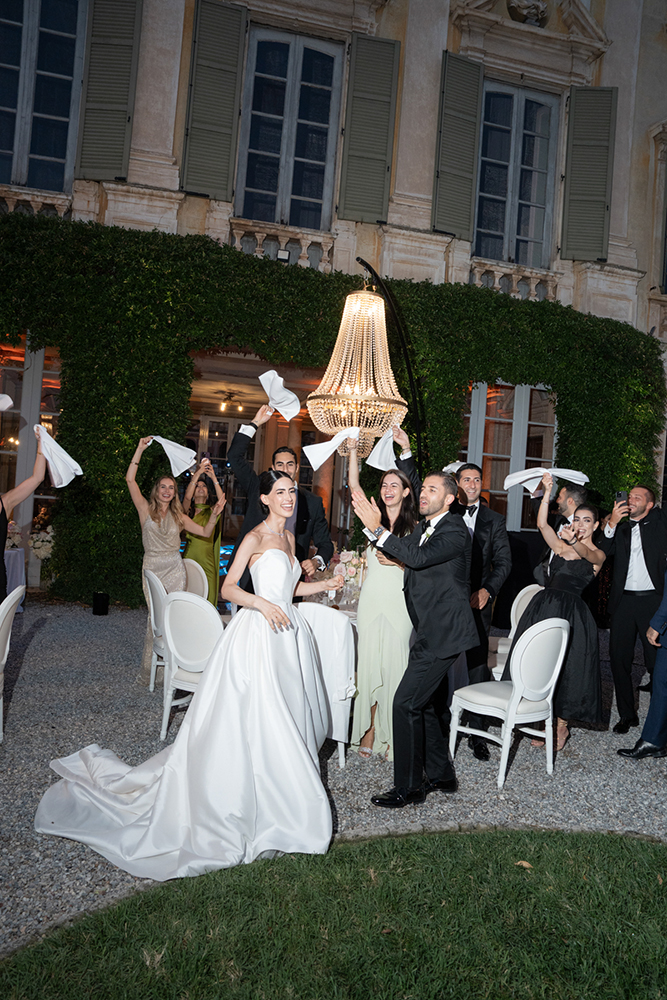 The bride wore a striking Vera Wang wedding dress , becoming an undeniable focal point throughout the day. During the aperitivo, the celebration transformed into an energetic day party, with live music by Bravo Wedding Music carrying from afternoon into the evening. Guests sang along, danced freely in the villa gardens, and embraced the unfiltered joy that defined the entire celebration.