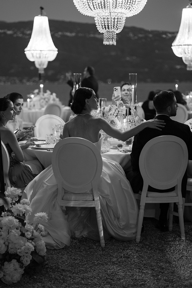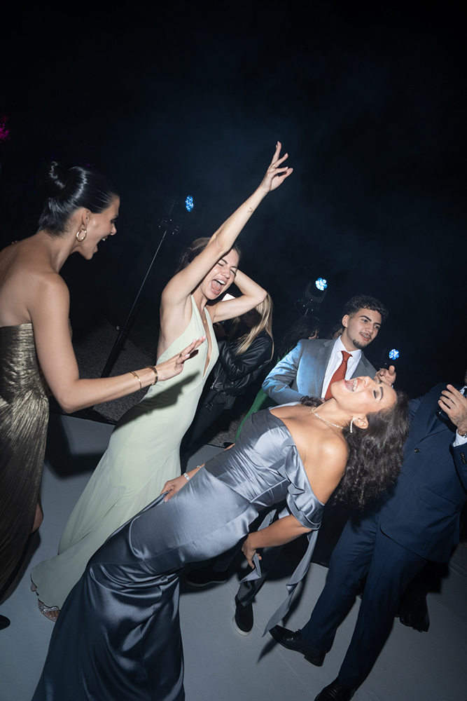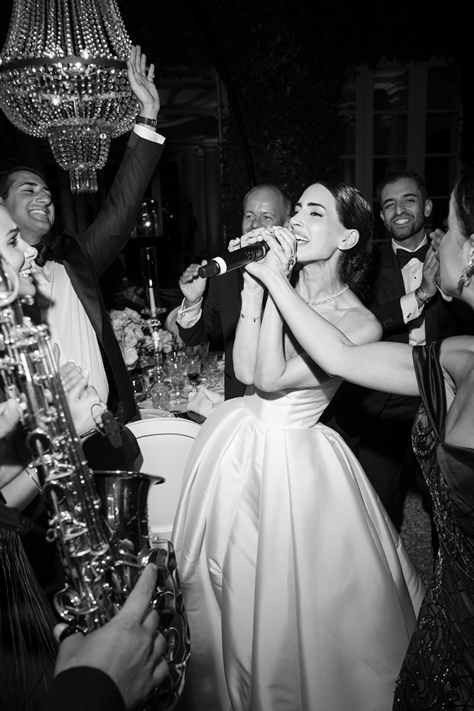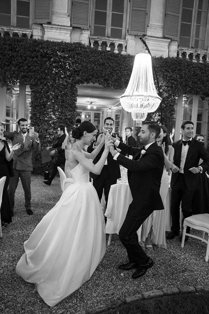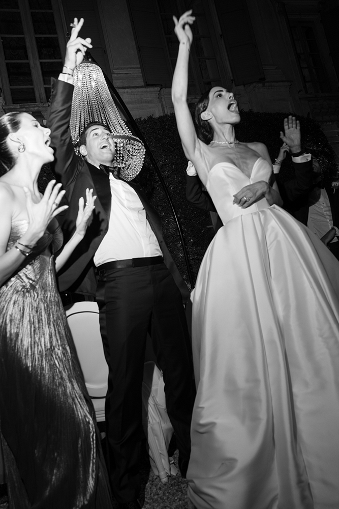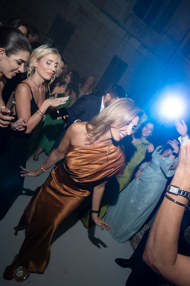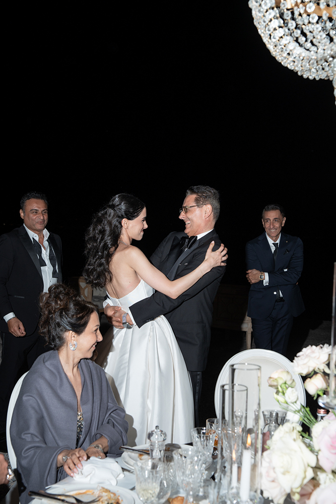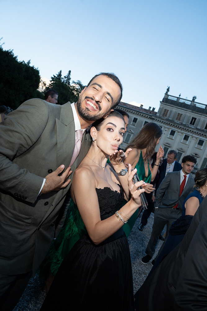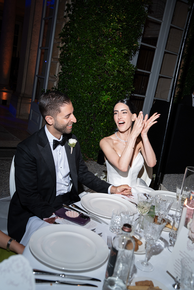 The bride wore a striking Vera Wang wedding dress , becoming an undeniable focal point throughout the day. During the aperitivo, the celebration transformed into an energetic day party, with live music by Bravo Wedding Music carrying from afternoon into the evening. Guests sang along, danced freely in the villa gardens, and embraced the unfiltered joy that defined the entire celebration.