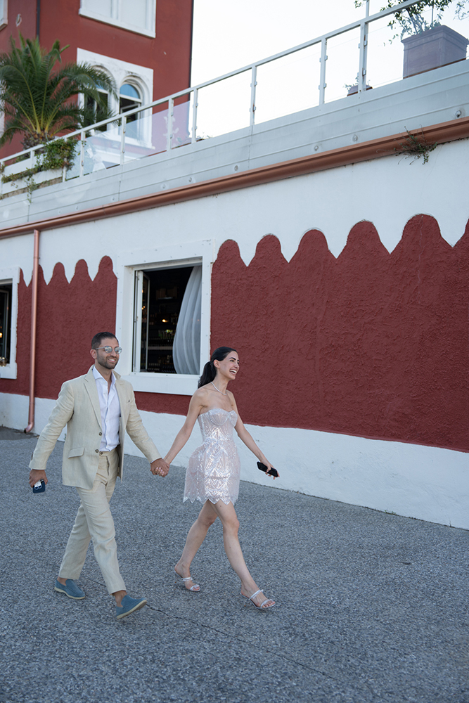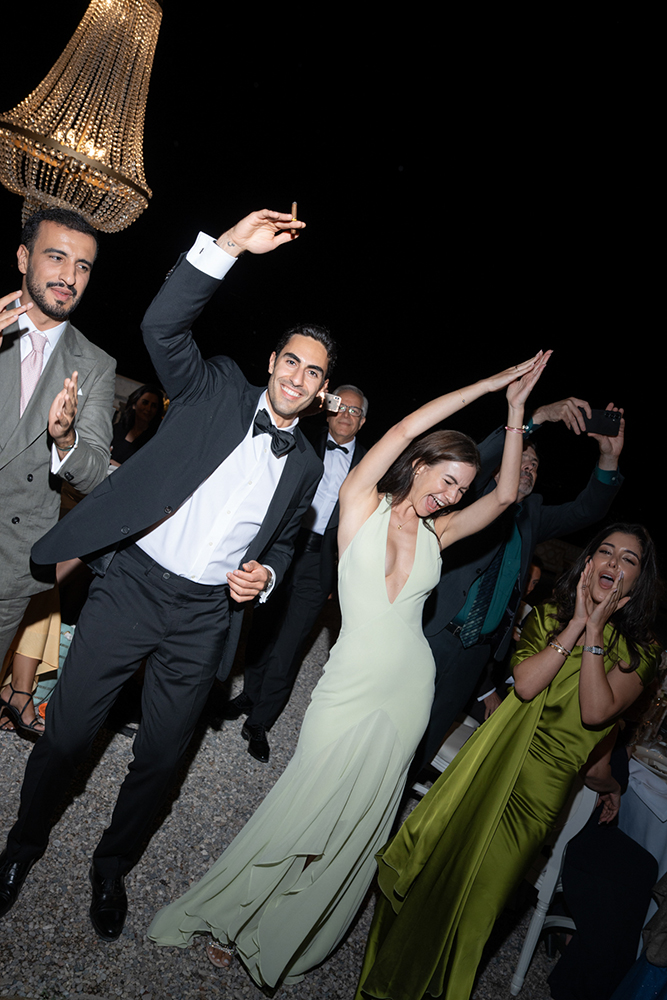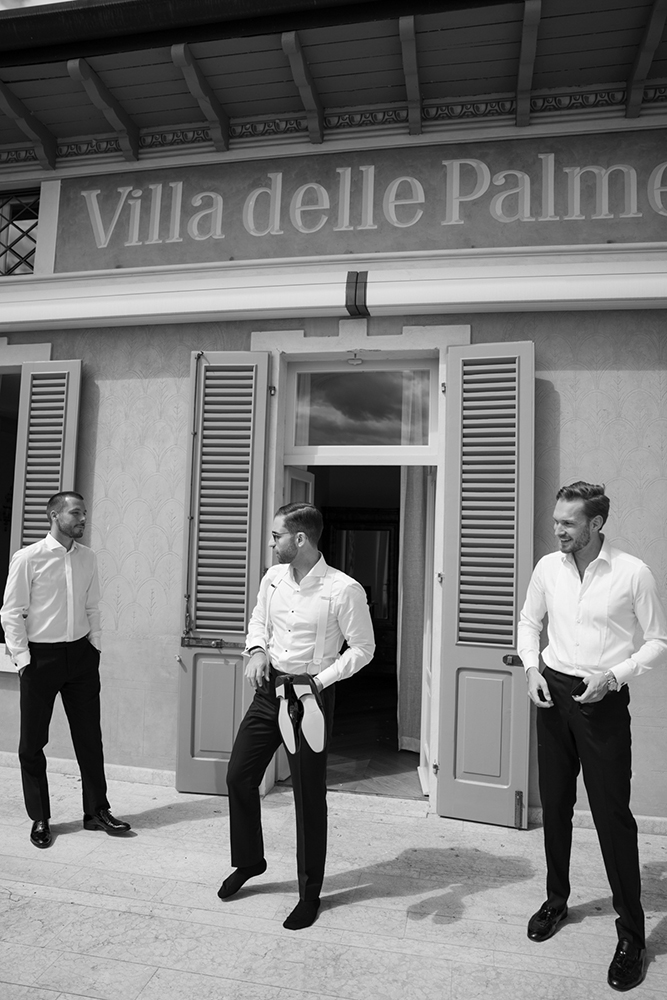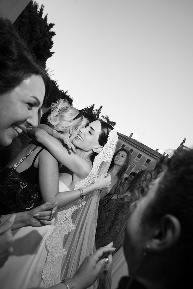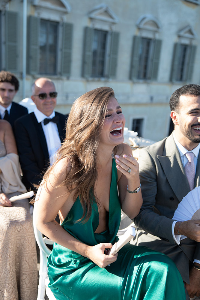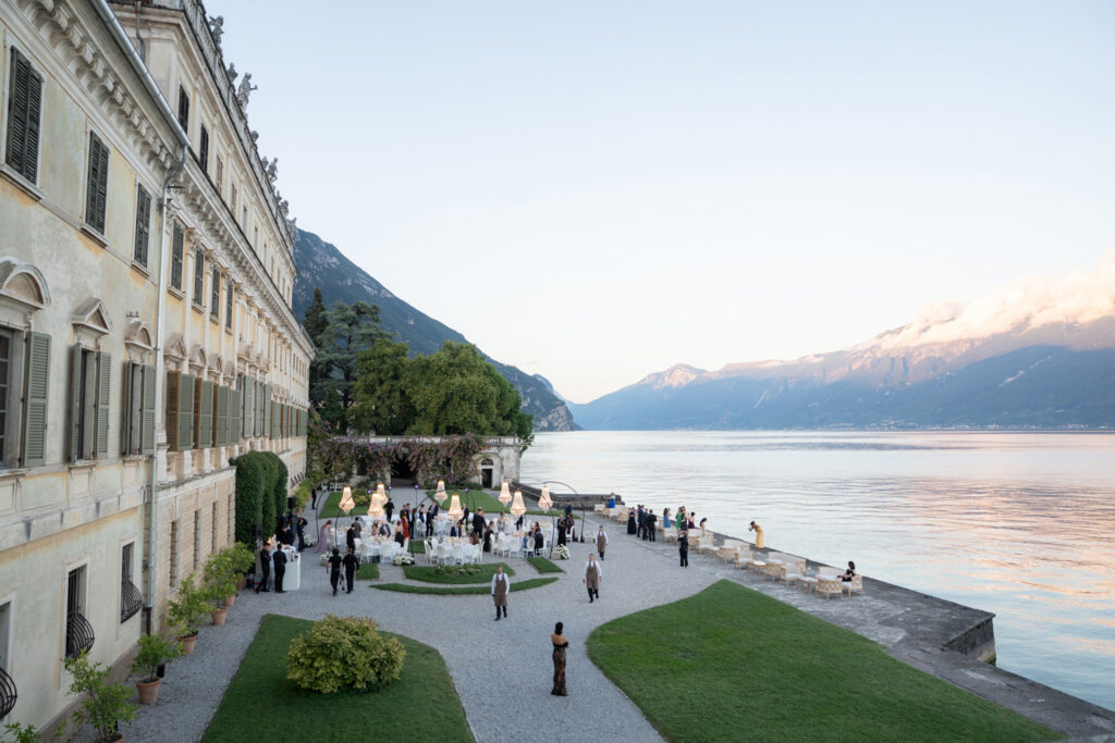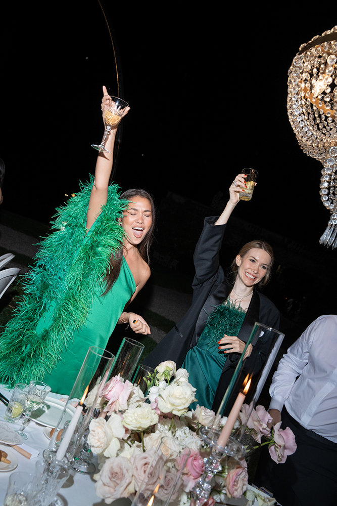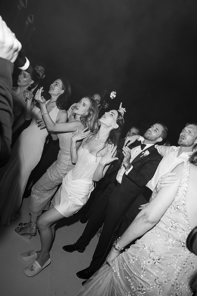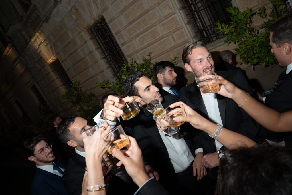 The bride wore a striking Vera Wang wedding dress , becoming an undeniable focal point throughout the day. During the aperitivo, the celebration transformed into an energetic day party, with live music by Bravo Wedding Music carrying from afternoon into the evening. Guests sang along, danced freely in the villa gardens, and embraced the unfiltered joy that defined the entire celebration.