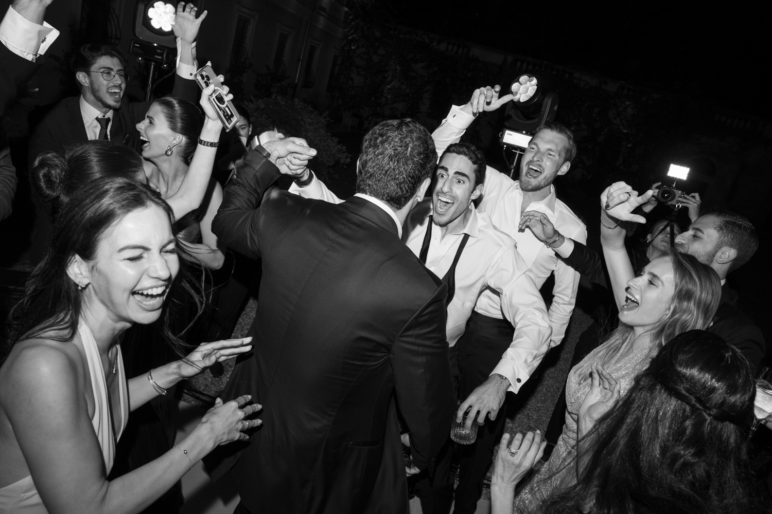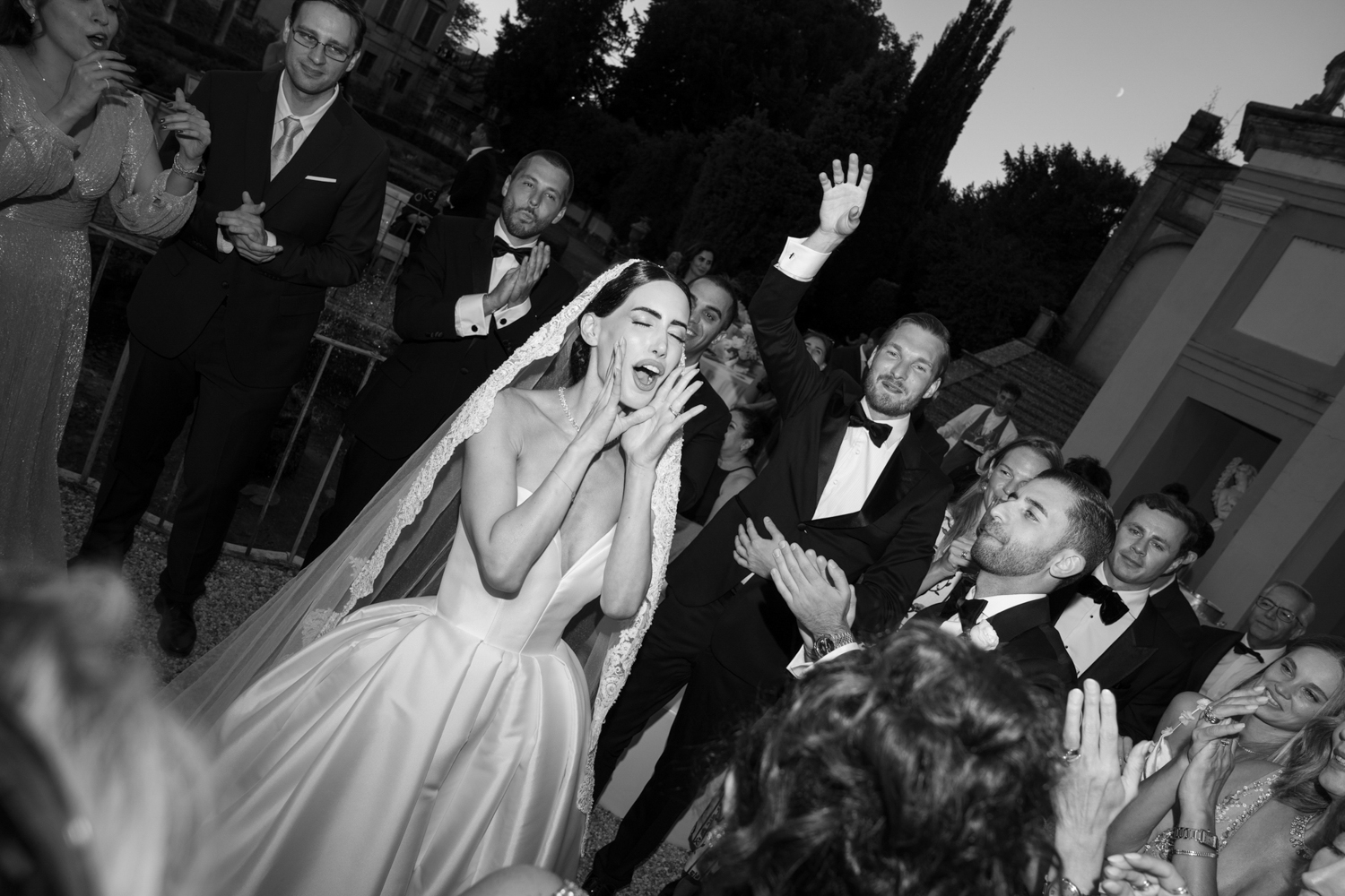 The bride wore a striking Vera Wang wedding dress , becoming an undeniable focal point throughout the day. During the aperitivo, the celebration transformed into an energetic day party, with live music by Bravo Wedding Music carrying from afternoon into the evening. Guests sang along, danced freely in the villa gardens, and embraced the unfiltered joy that defined the entire celebration.